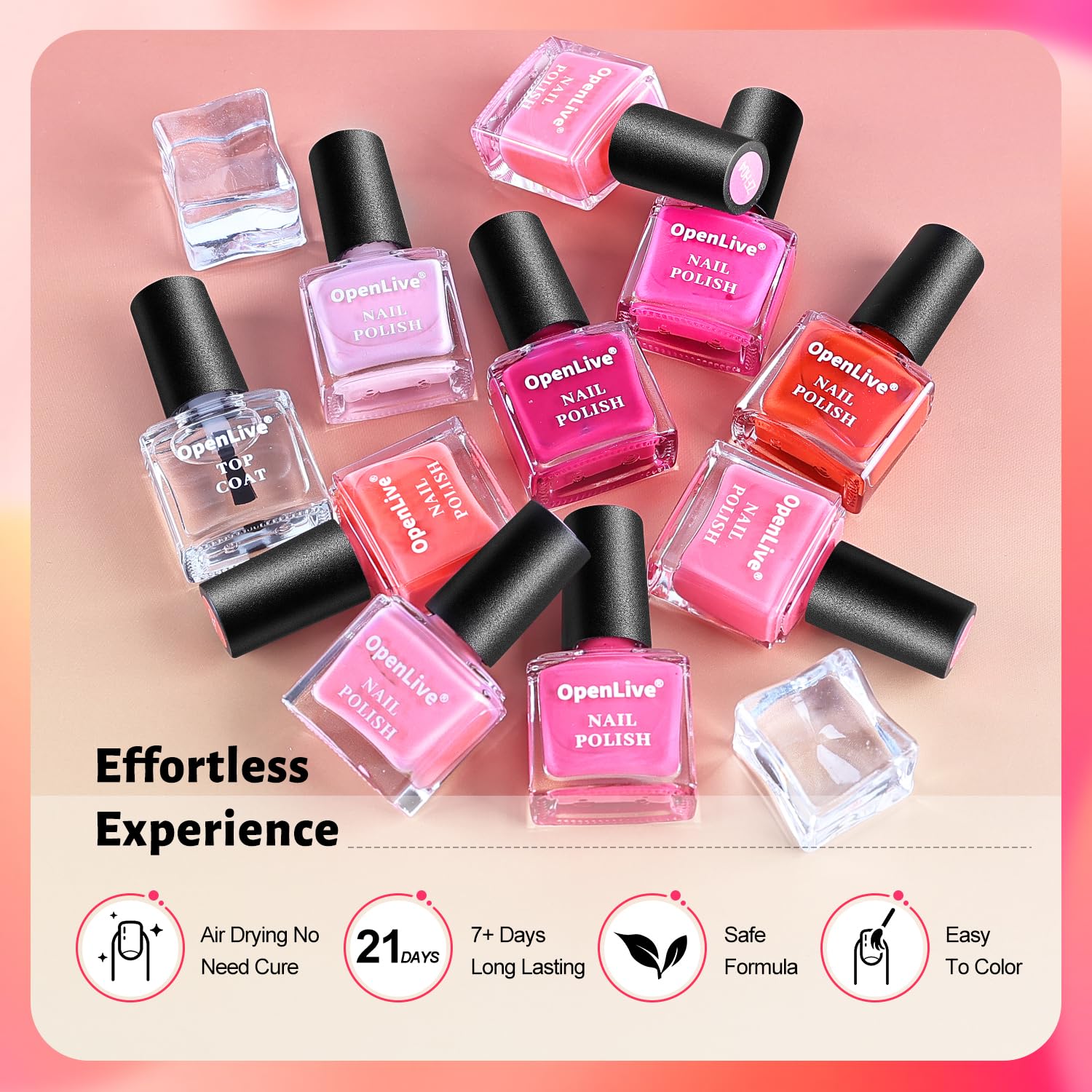 【Vivid Color Display】Each color in the OpenLive nail polish set is highly colors, providing a rich and vivid color payoff.From bright, bold hues to soft, subtle shades, look even more beautiful on your nails. The base coat helps to enhance the color of the polish, while the top coat adds an extra layer of shine and protection to the nails.