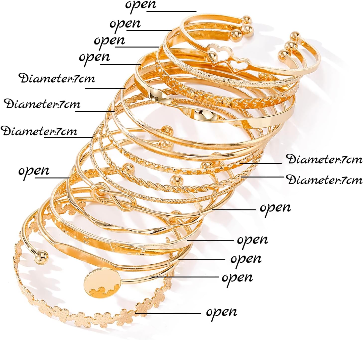 The bangle diameter of the bracelet is 2.76”(7cm) ,all 11 pcs open cuff bracelet, solo or stackable for boho look, add more playful elegent charm.
