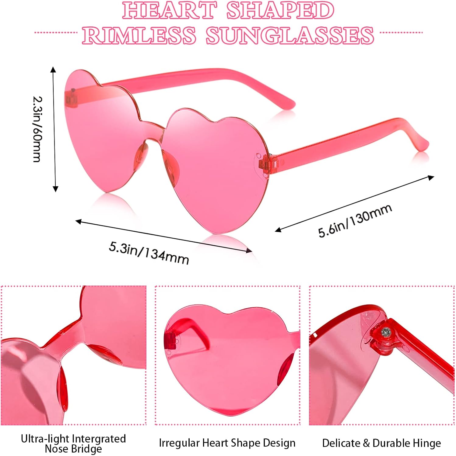 RELIABLE MATERIAL: The rimless heart sunglasses is made of plastic; reliable material makes them lightweight and proper elasticity makes them easy to put on without getting broken or deformed easily.