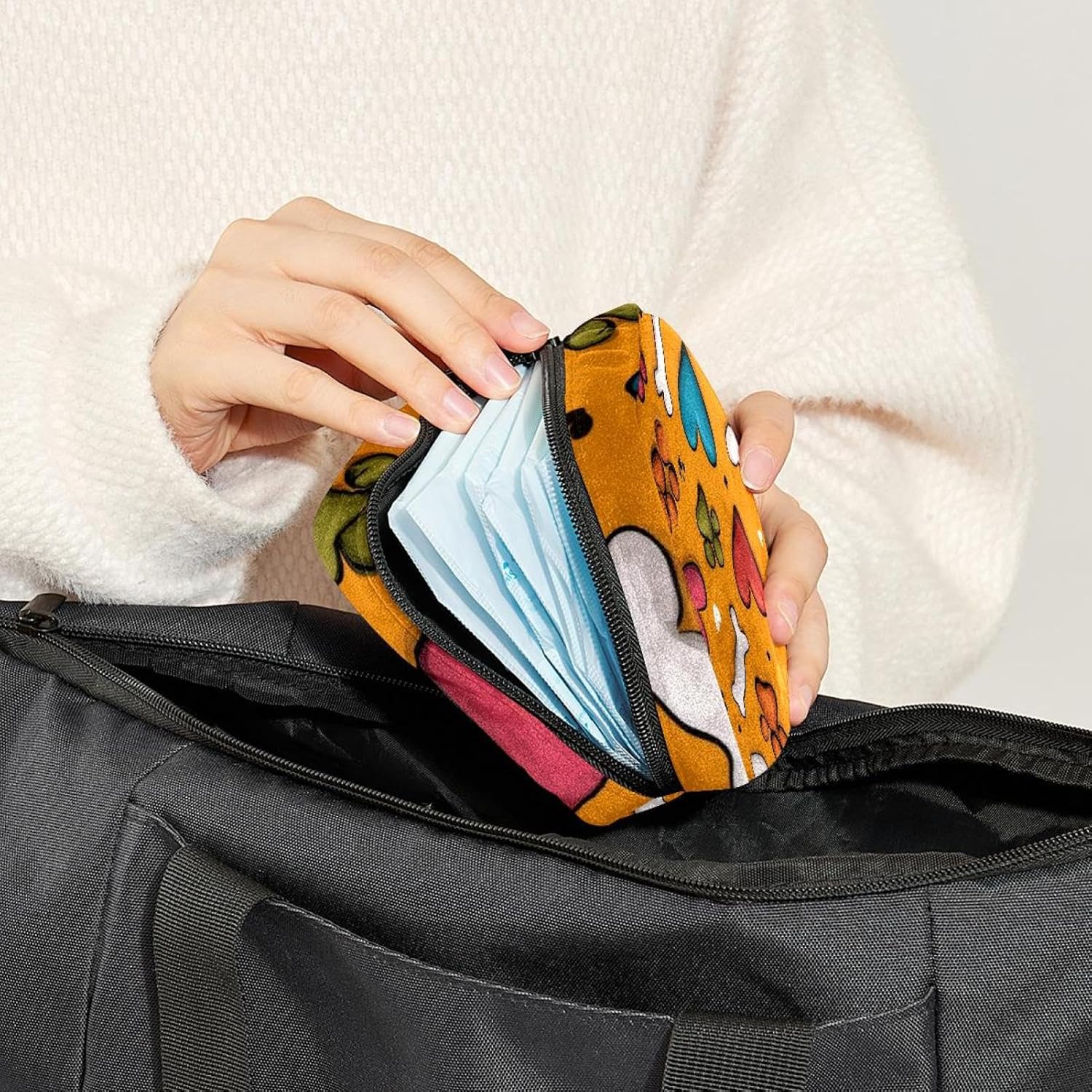 Multifunctional Storage Bags – This cute storage purse can not only store feminine products, such as sanitary napkins, menstrual cups, tampons, panty liners, nursing pads, also can be used as a makeup bag to hold your small items, such as cosmetics, mini mirrors, lipstick, stationery, jewelry, credit cards, etc.