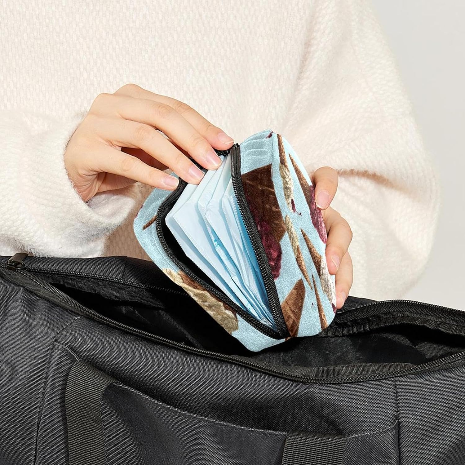 1Pc Portable Sanitary Napkin Storage Bag, Menstrual Cup Pouch, Feminine Care Pads Bag for Girls Women, Tampons First Period Kit, Ice Cream Seamless Pattern
