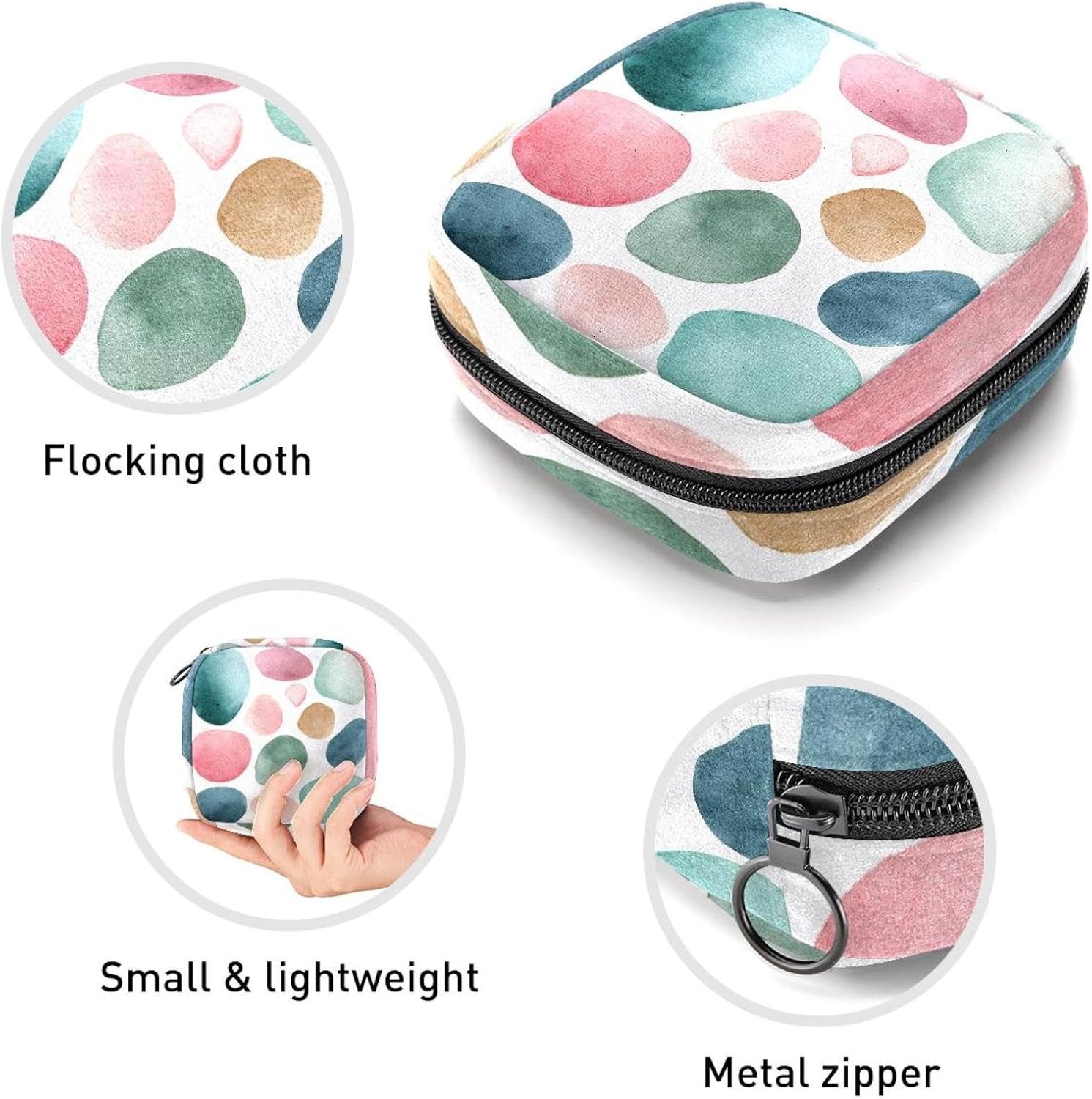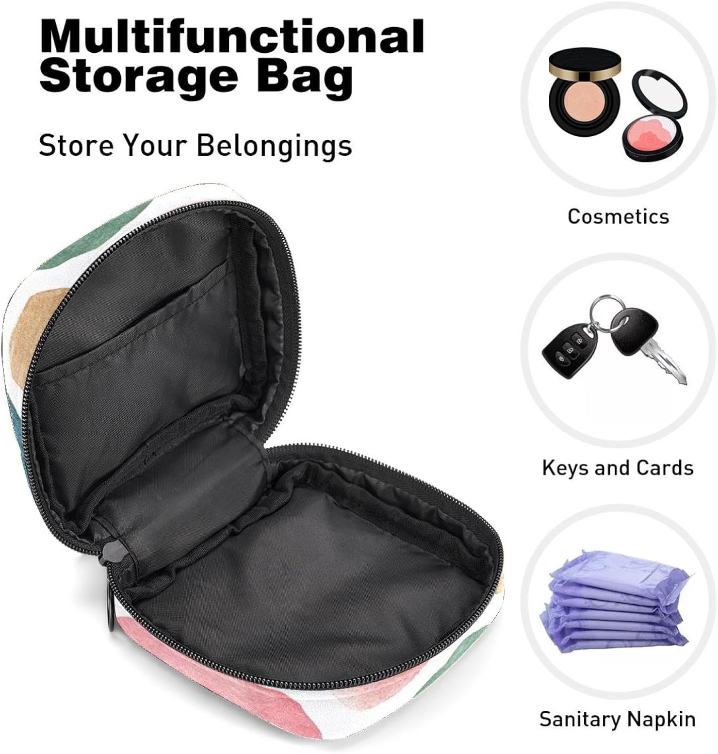 Multifunctional Storage Bags – This cute storage purse can not only store feminine products, such as sanitary napkins, menstrual cups, tampons, panty liners, nursing pads, also can be used as a makeup bag to hold your small items, such as cosmetics, mini mirrors, lipstick, stationery, jewelry, credit cards, etc.