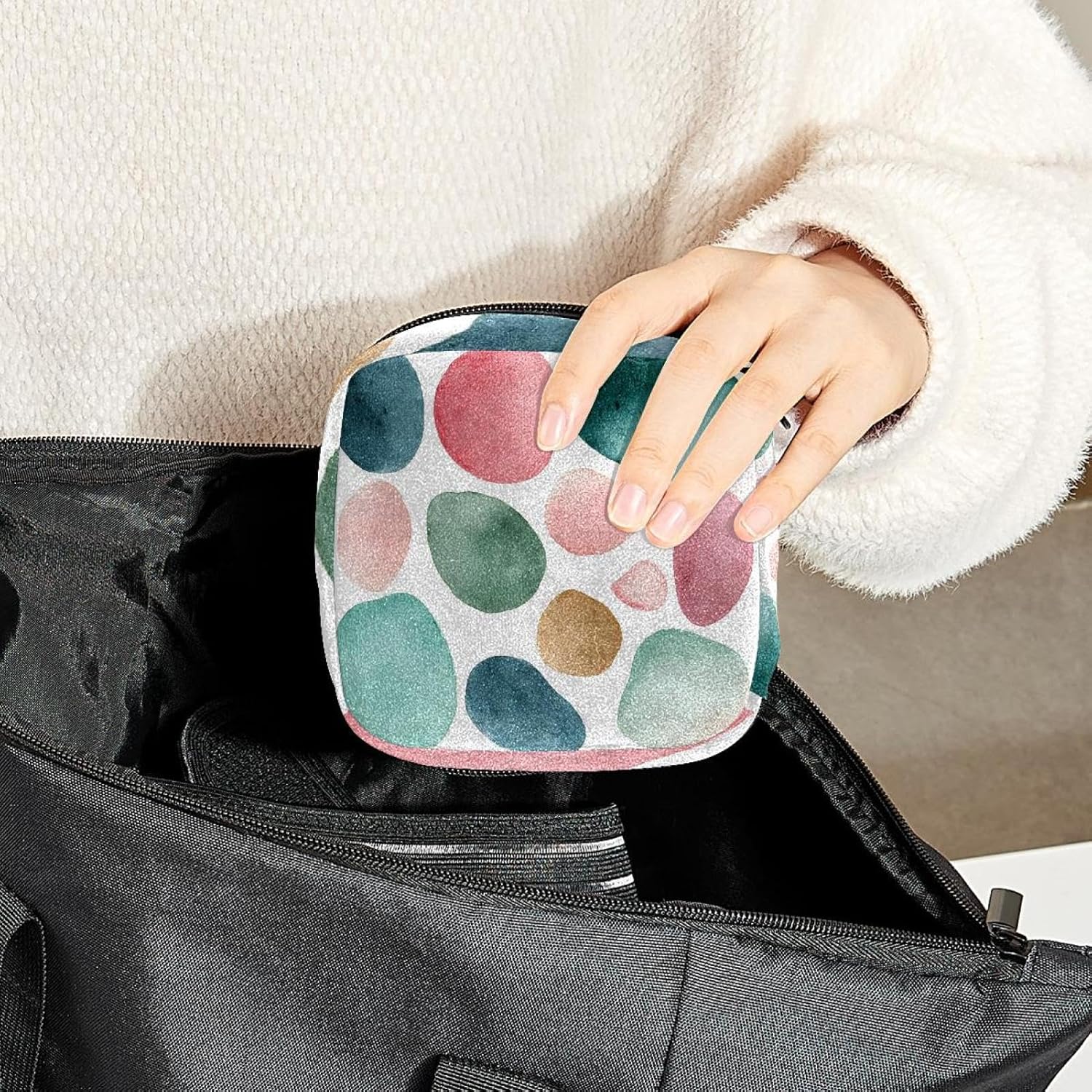 Size – 6.6*6.6*4.7 inch/17x17x12 cm, compact size and easy to carry, easily put in backpack or handbag when school, work, travel. The period bag can hold up to 10 pieces sanitary napkins, enough for one day’s replacement, a small compartments inside for small sanitary napkins.