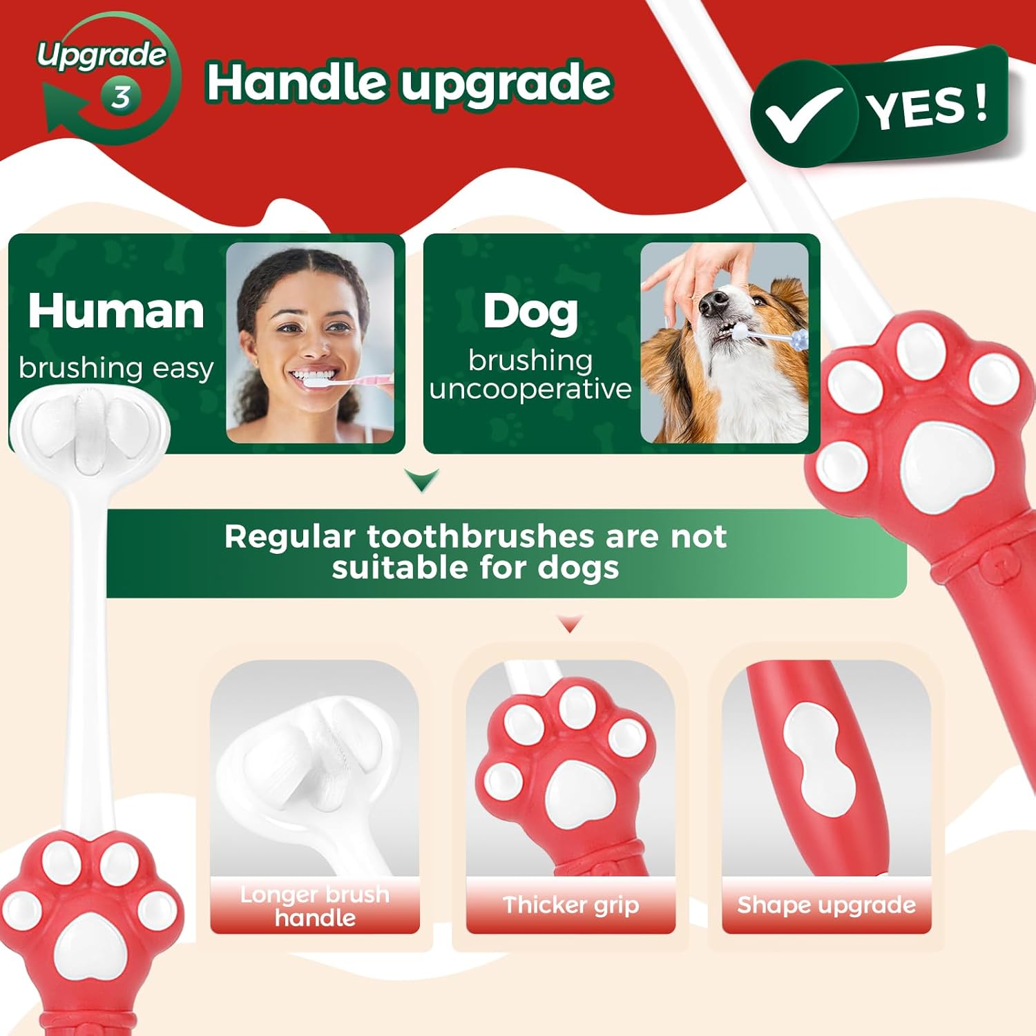 [Designed Bristle Angle] The 3-sided bristles are designed at a scientific angle to efficiently wrap around your dog’s conical-shaped teeth