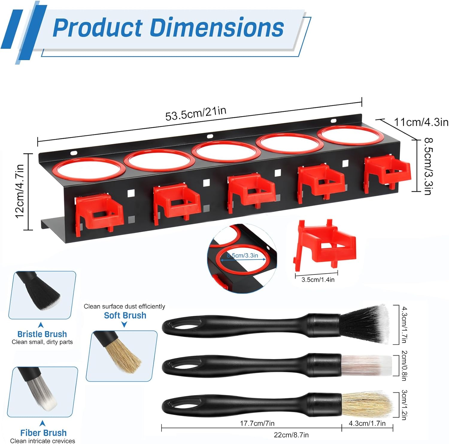 FUNCTIONAL – Spray can holder garage bottle organizer can store watering can, Spray Bottle abrasive, wax jar, etc.Meet diversified needs.The rack with 5 holes and a variety of accessories.All tools and accessories are in good order in detailing.You can easily access your favorite wheel cleaner, paint spray, tire polishing agent, car soap and car lubricating oil on the rack to keep it organized.