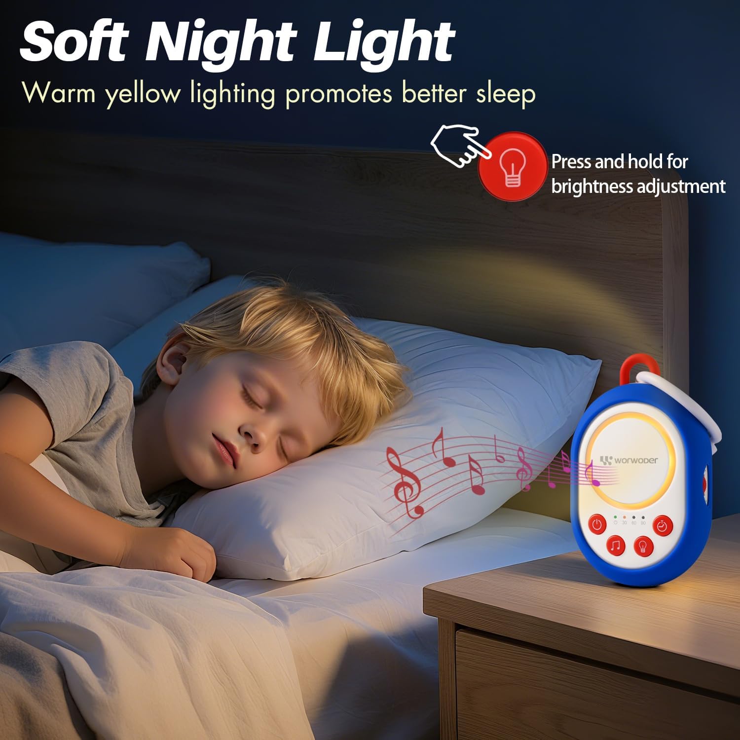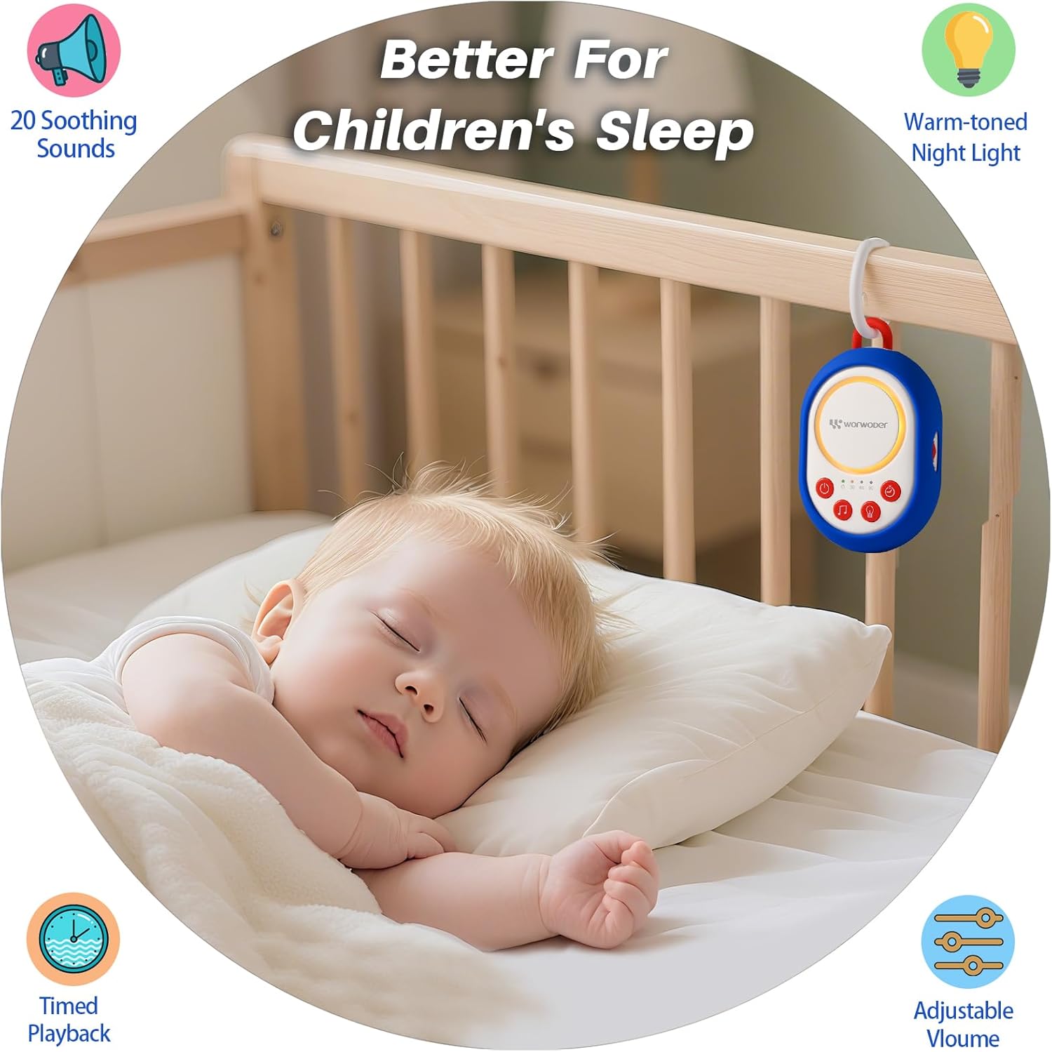 【Stop Nighttime Wake-Ups】 Gentle amber nightlight + 20 soothing sounds (white noise, lullabies, nature) mask disruptive noises (siblings, traffic, pets) so baby sleeps longer & deeper. Adjustable brightness lets you see for feeds/diapers without fully waking them.