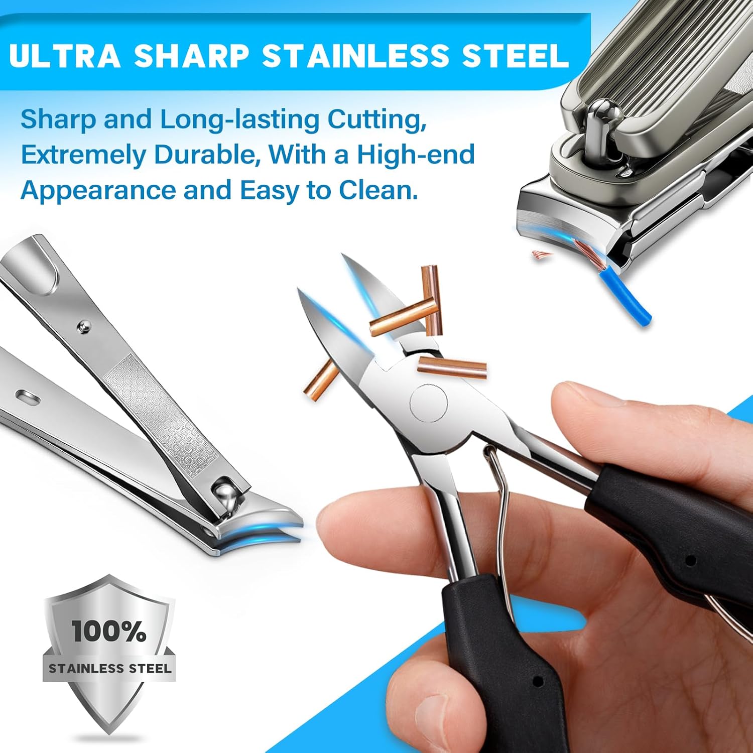 Upgraded 45° Angled Nail Clippers:This newly upgraded angled nail clipper features a biomimetic 7-shaped design, giving you a clear view of the blade and nails for more accurate trimming—no more awkward bending or twisting. The cutting surface is 30% larger than regular angled clippers, with sharper blades for effortless trimming. Ideal for elderly users or individuals with limited mobility, especially those with thick or severely ingrown toenails.
