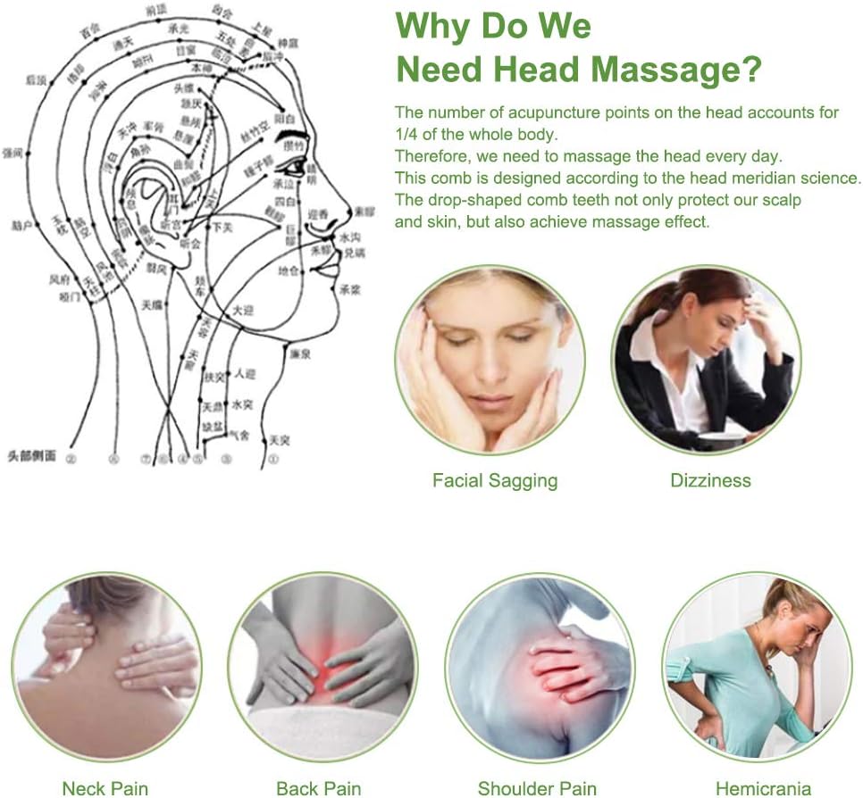 MULTI-PURPOSE MASSAGE – The head massager is not only for head, scalp massage, but also for arms, chest, finger especially for people with frequent shoulder and spinal pain. Comb scraping massage also improves mi-crocirculation, eases pain from periarthritis migraine etc. Both acupuncturist & physical therapists regard acupoint massage as green natural therapy, and via this way can help to diminish stress, fatigue, exhaustion, better to relax the whole body.