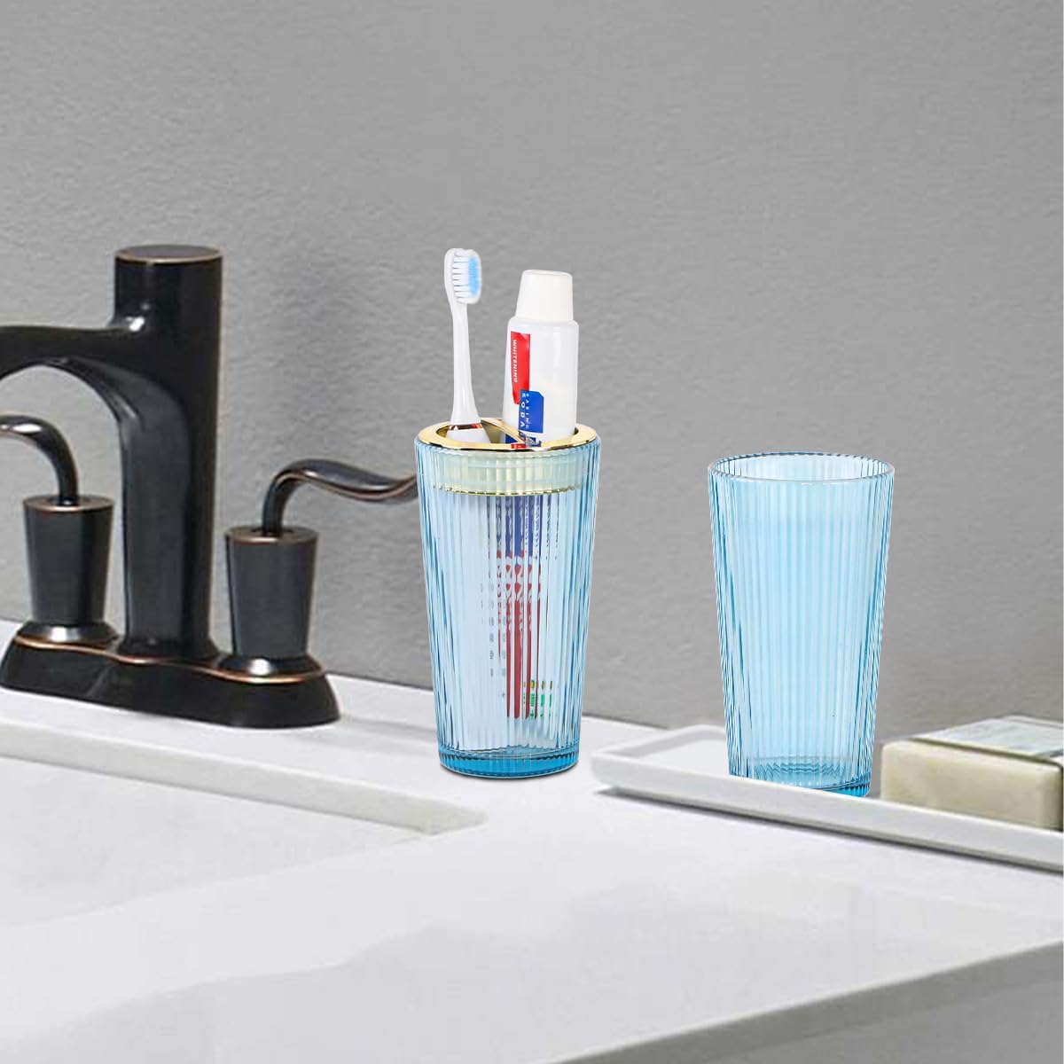 2pcs Toothbrush Holders for Bathrooms, Glass Toothbrush Holder and Bathroom Tumbler Cup, Toothbrush Toothpaste Holder, Bathroom Tooth Brush Cup Holder for Toothpaste,Razor (Blue and Gold)