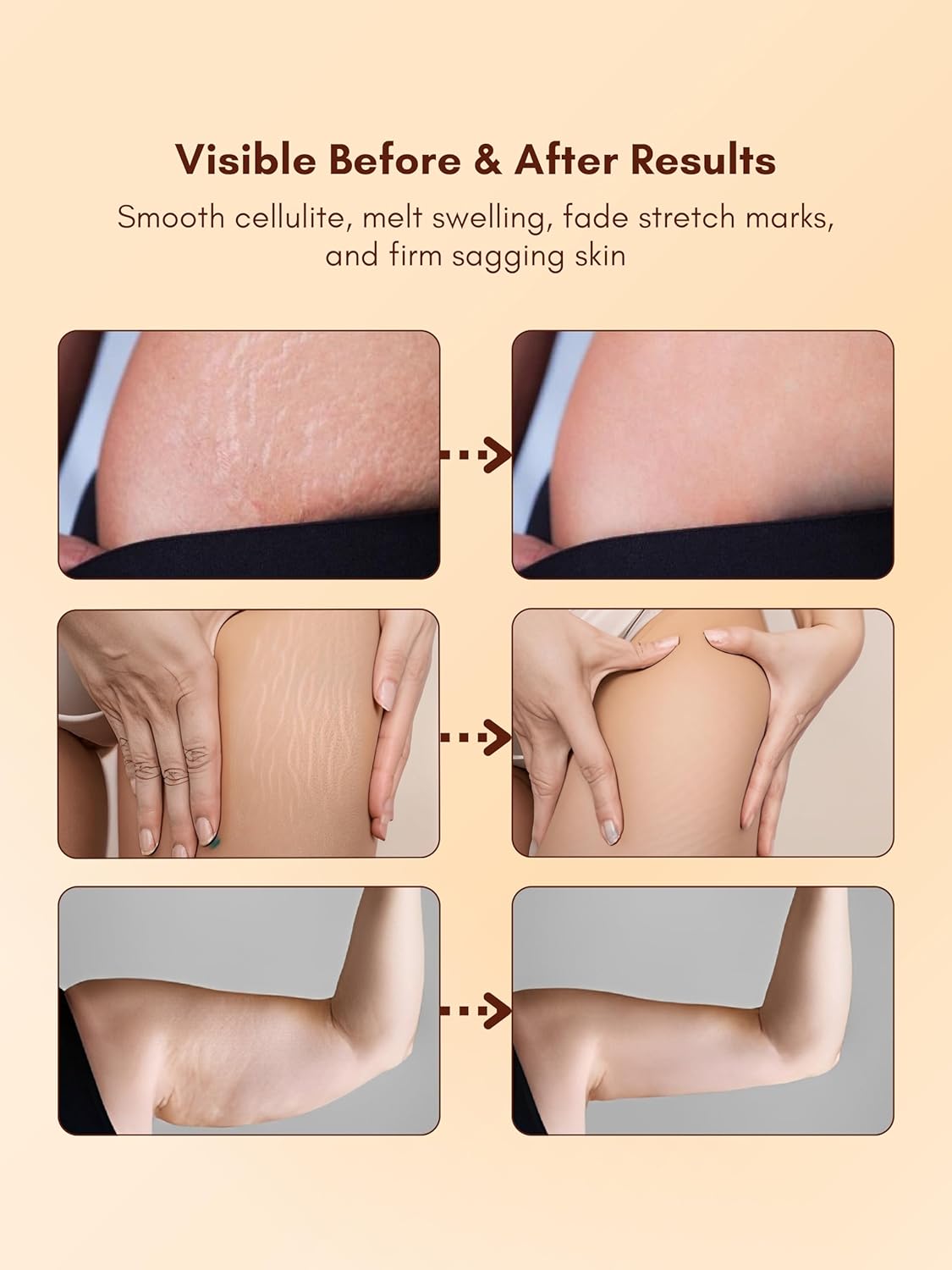 ✅ Anti-Cellulite & Skin Firming – Smooth & Tighten: Designed with a combination of gentle heat, vibration, LED light, and SoothingPulse, this cellulite massager targets stubborn fat deposits and stretch marks. It promotes collagen production, improves elasticity, and firms sagging skin—revealing smoother, more toned, and youthful-looking skin.