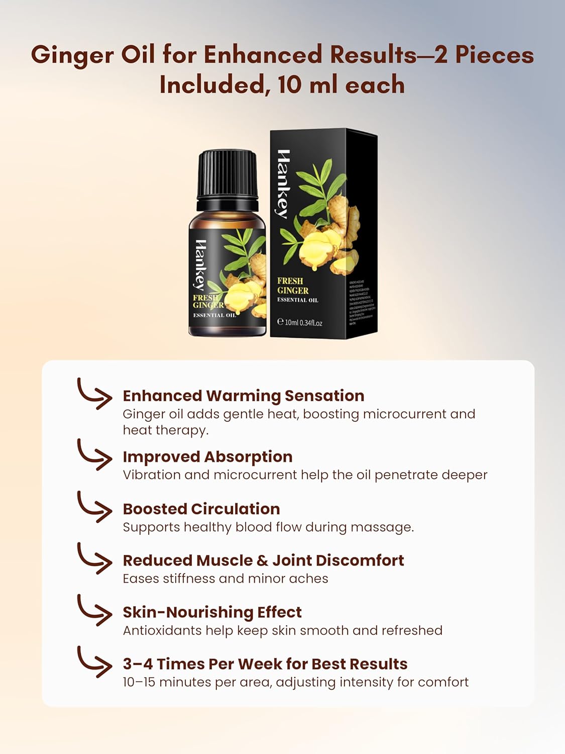 ✅ Boost Results with Ginger Massage Oil: For the best experience, pair your massager with Ginger Massage Oil. Known for its natural warming and circulation-boosting properties, ginger oil helps stimulate lymphatic flow, reduce water retention, and support fat metabolism. It also improves skin elasticity and smoothness, making it the perfect partner for anti-cellulite massage and full-body detox.