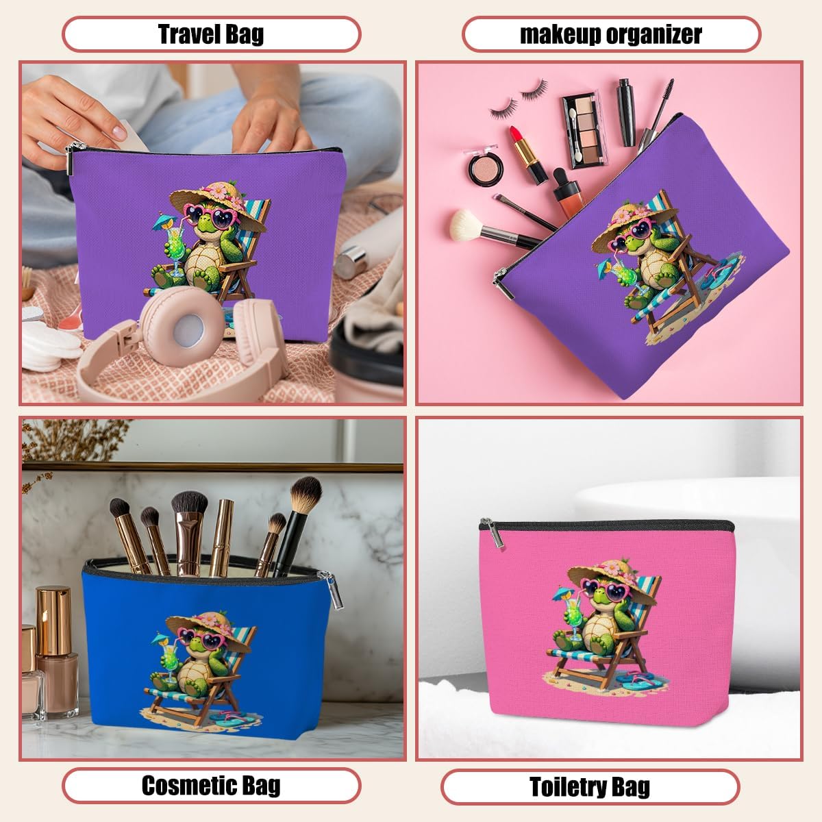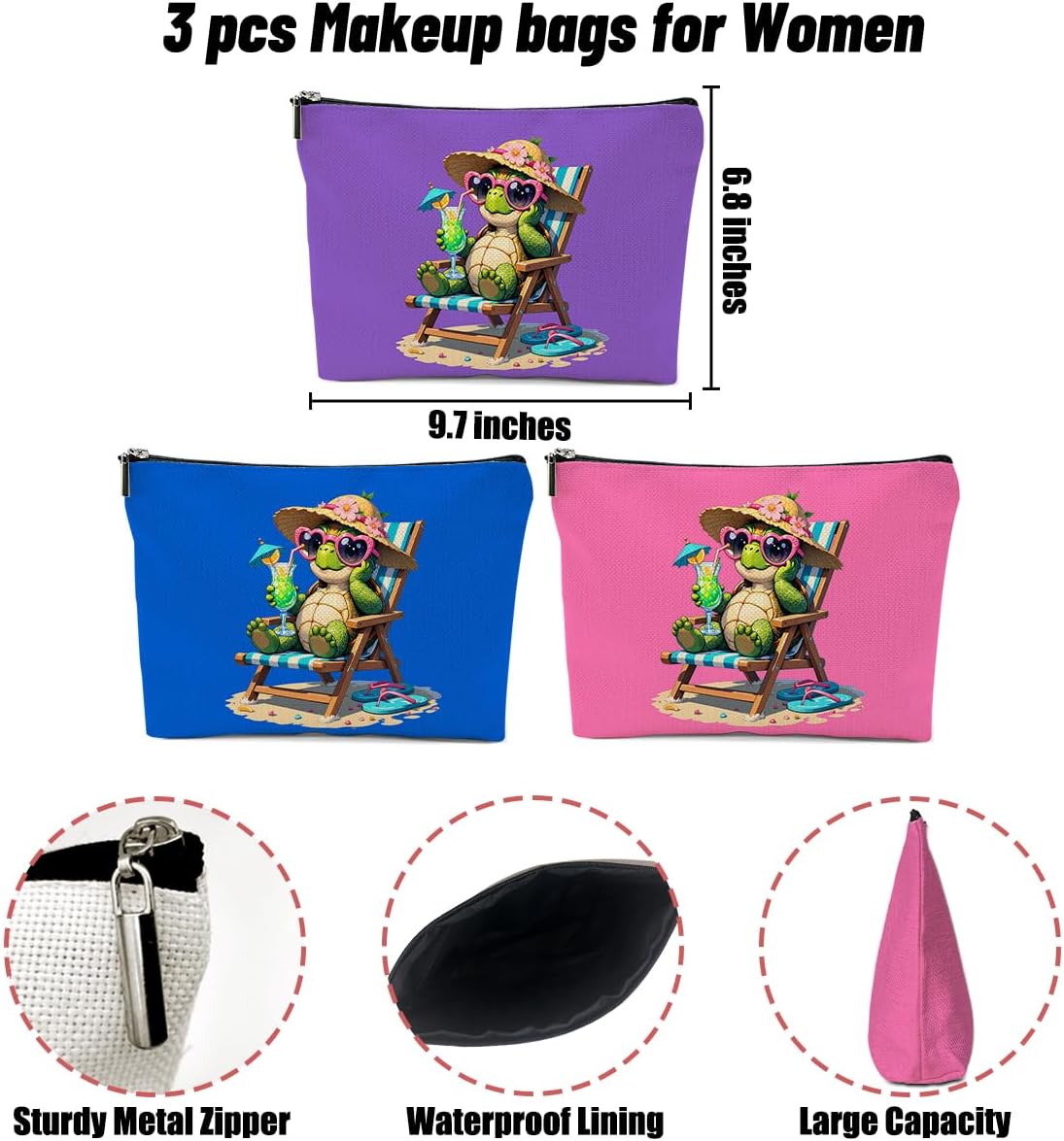 3 Pack Funny Beach Sea Turtle Gifts for Women Turtle Lovers Teacher Girls Trip Makeup Bag,Travel Essentials Cosmetic Bags for Women,Birthday Graduation Christmas Friendship Girl Weekend Thank You