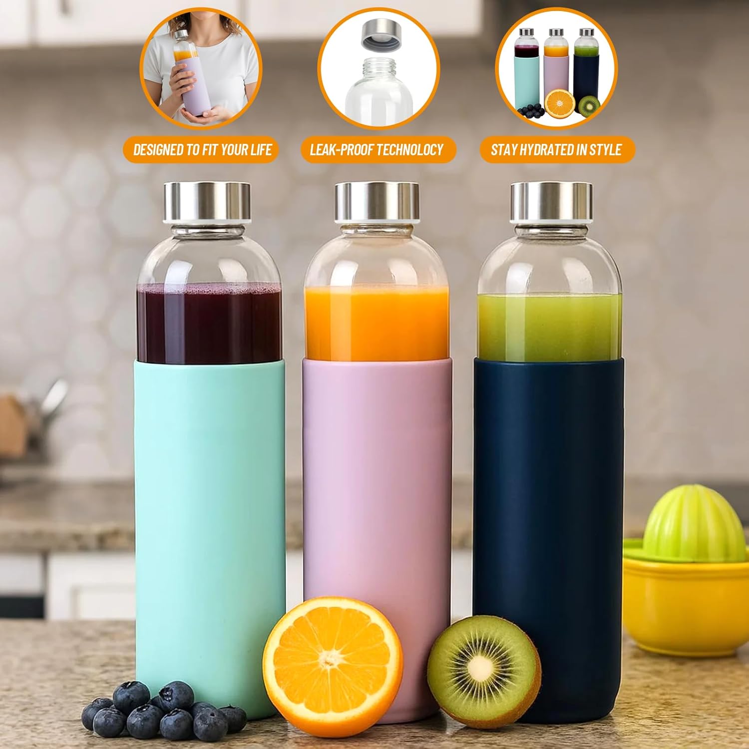 Durable Glass with Protective Silicone Sleeve:Each 32 oz bottle is made from thick, premium glass and wrapped in a non-slip silicone sleeve for a secure grip and extra protection from bumps or drops. Stylish, eco-friendly, and perfect for home, office, or gym use