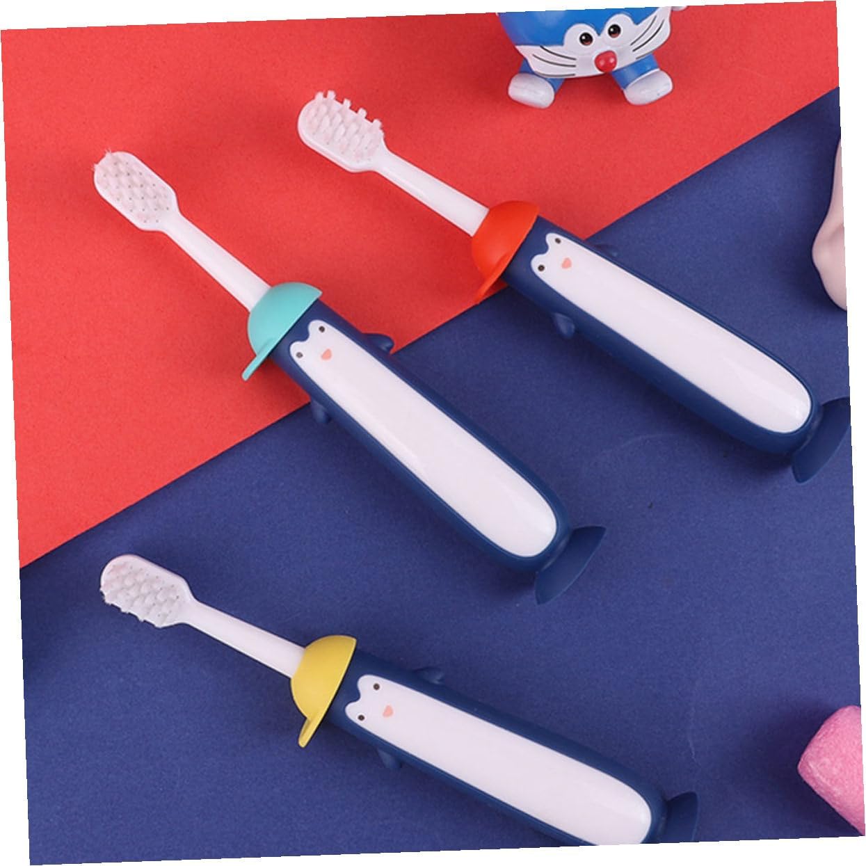 – Color: blue and red and yellow Bristles Toothbrush.