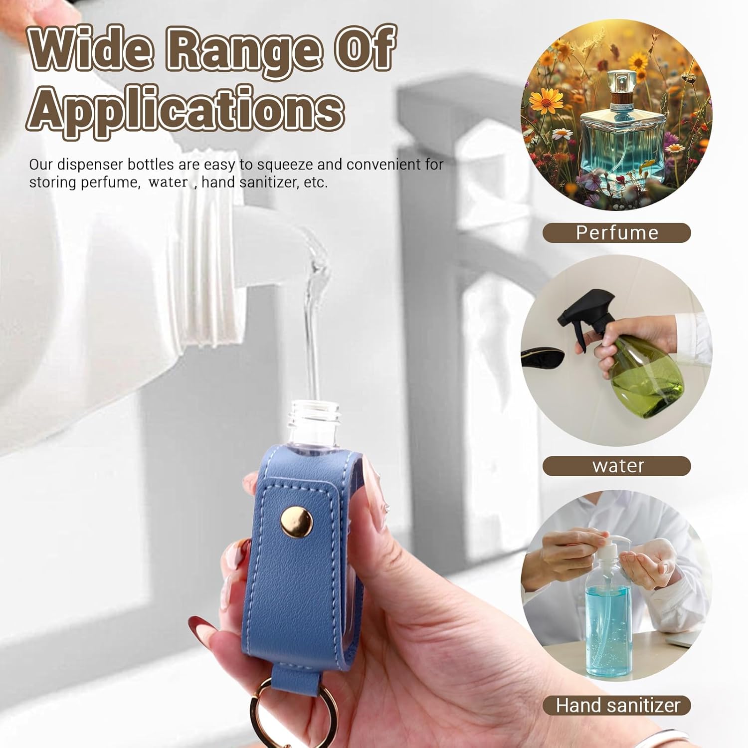 【Material and Pressure Spray】 This mini hand sanitizer keychain is composed of leather and sturdy. Refillable bottles are made of plastic. This hand sanitizer holder has a press type sealing lid, which is convenient to open and close