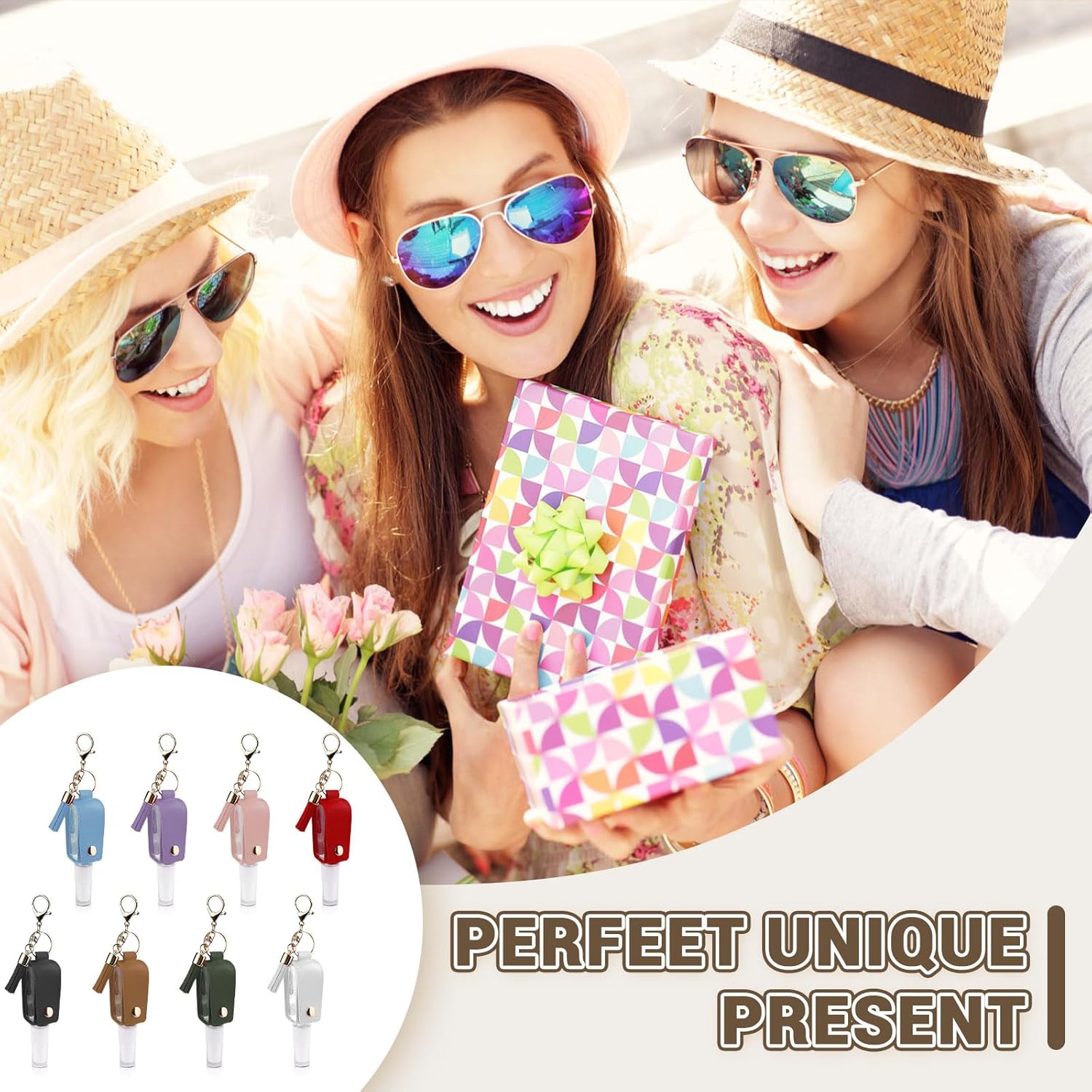 【Set Content】 Our hand sanitizer travel size keychain set consists of 4 colored keychains, all with capacity of 1 oz (30 ml). Their leather covers are black, white, pink, blue. They are also fun accessories to carry around with people