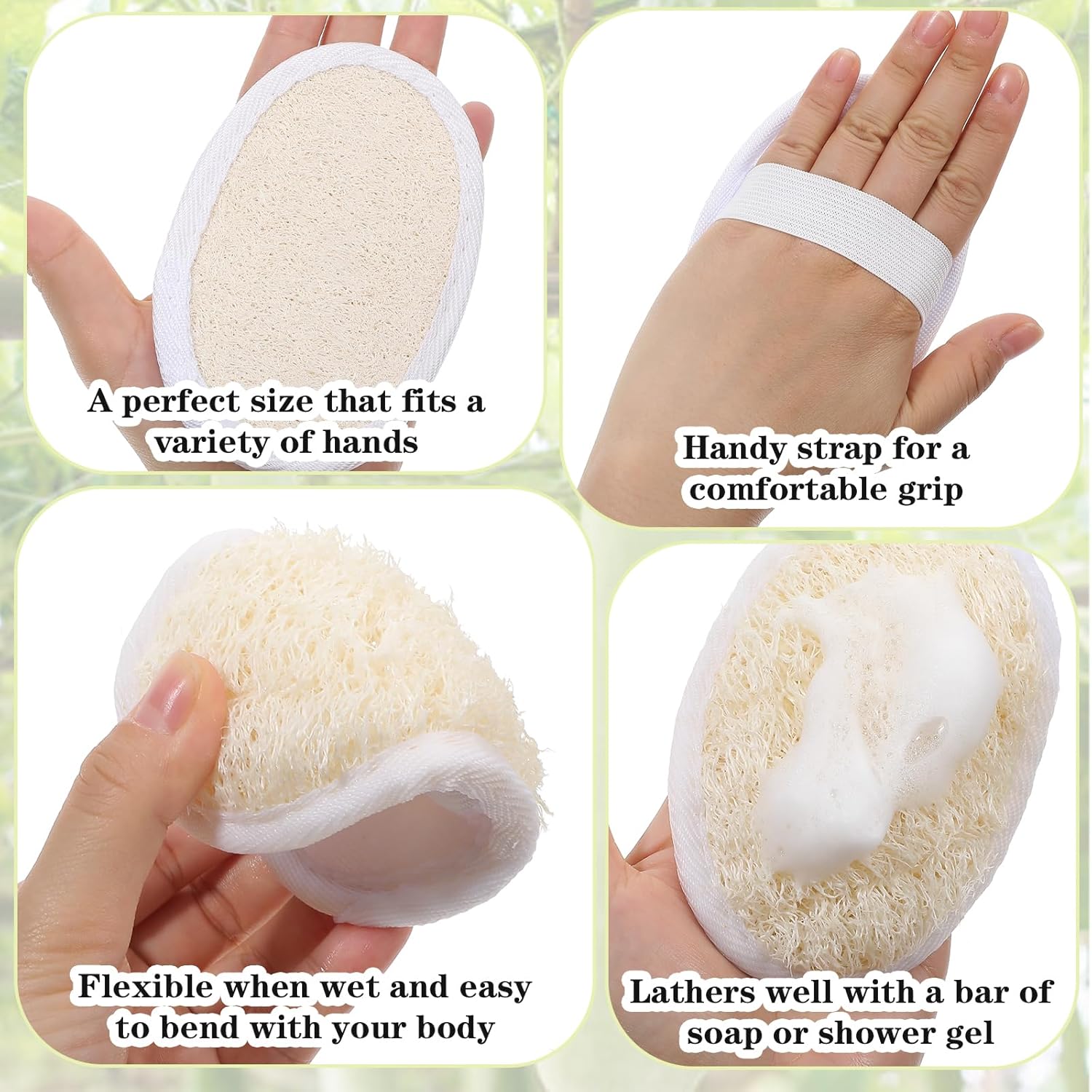【Easy to Use】Each loofah sponge features an elastic hand strap and terry cloth backing, ensuring a secure grip during use. Before bathing, simply soak the shower loofah in warm water to soften it; after use, hang it with the attached loop for quick drying. This practical design makes the bath scrubber easy to handle and maintain, promoting hygiene and extending the product’s lifespan through proper care.
