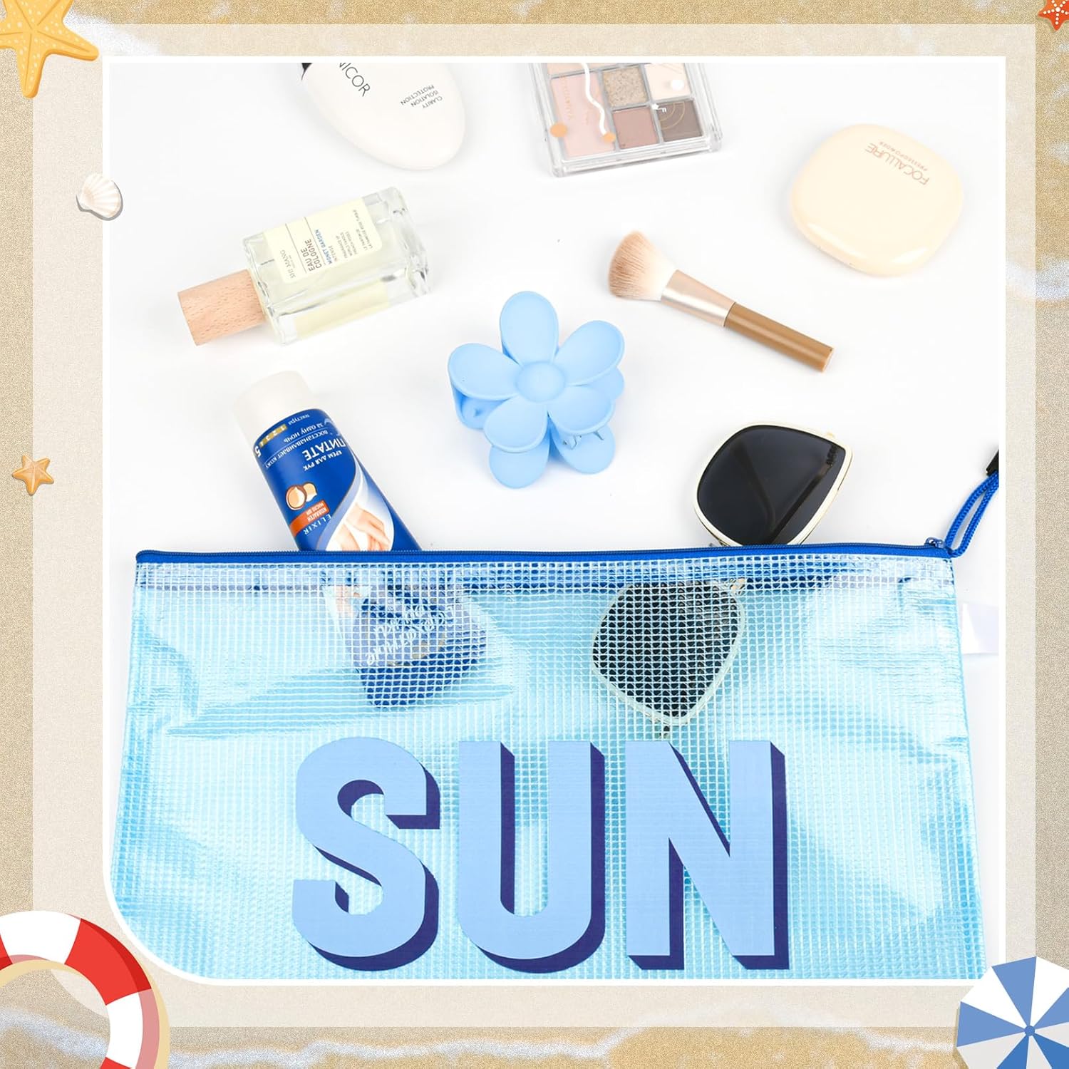4PCS SUN Makeup Bag Clear Zippered Sunscreen Bag Cosmetic Pouch Waterproof Travel Toiletry Organizer for Women Varsity Letter Patch Beach Pool Essentials