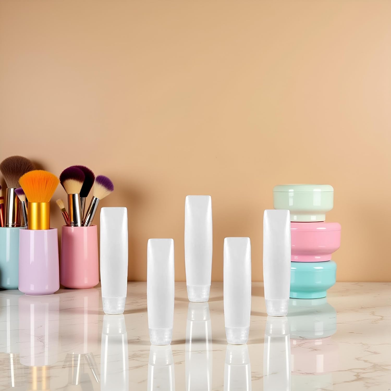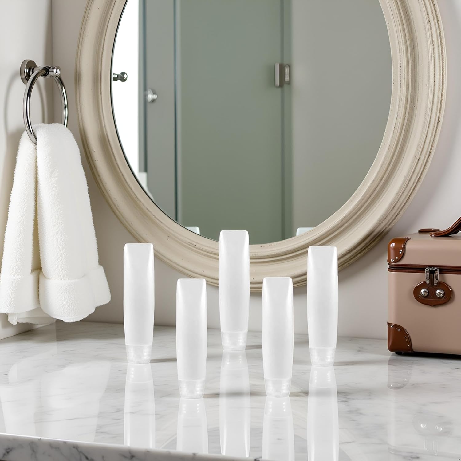 Take your favorite toiletries and cosmetics on-the-go with these convenient 1 oz travel bottles. The set includes 5 refillable squeeze tubes perfect for toothpaste, lotions, creams, and other personal care products. Their compact size makes them ideal for carry-on luggage, gym bags, or overnight trips. The squeeze design allows for easy dispensing while minimizing product waste. Each tube features a secure closure to prevent leaks during transport. The clear containers let you easily identify contents and monitor product levels. These versatile dispensers are perfect for decanting your full-size products into TSA-compliant portions for air travel. The slim profile helps maximize space in your toiletry bag while still holding enough product for short trips. Keep your travel routine organized and hassle-free with these practical refillable tubes.
