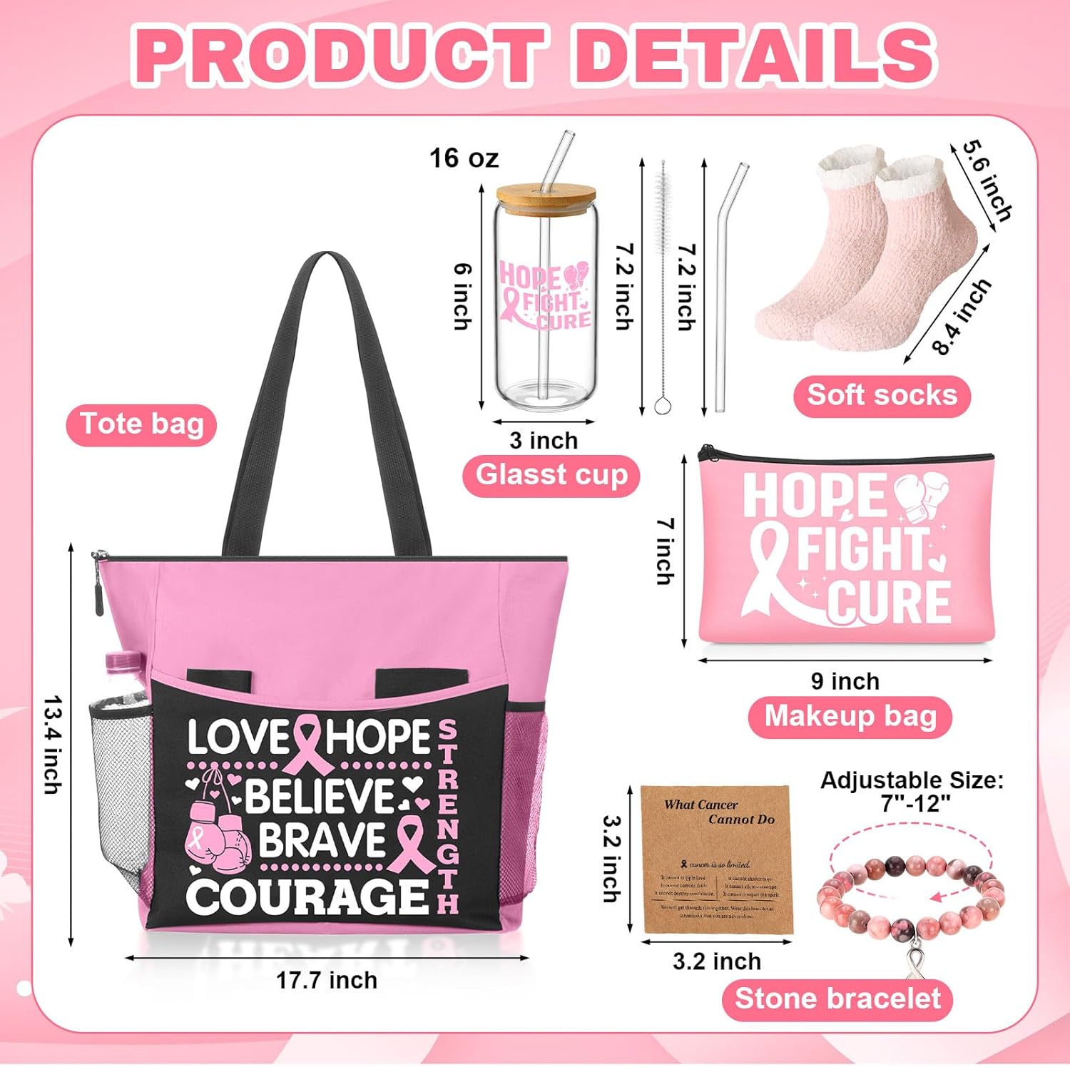 Thoughtful Breast Cancer Awareness Gift Set: includes a pink ribbon themed tote bag (18 x 14 x 5.2 inches), a zippered makeup tool bag (7 x 9 inches), an inspirational bracelet with a card, a glass cup with a bamboo lid and straw hole, and a pair of pink socks; A nice and practical gift choice for women, sure to be appreciated and loved
