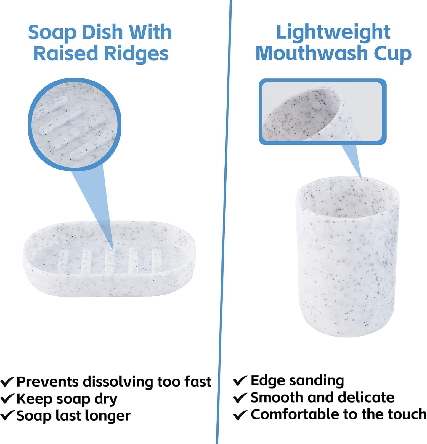 【Value Countertop Accessories】YITOBA Bathroom Accessory Set includes a 5-slot tooth brush holder, bar soap holder for shower and mouthwash cup in a stylish marble pattern that perfectly matches your bathroom. Its elegant and modern design not only enhances the decorative effect, but also saves space and keeps the countertop clean and tidy.