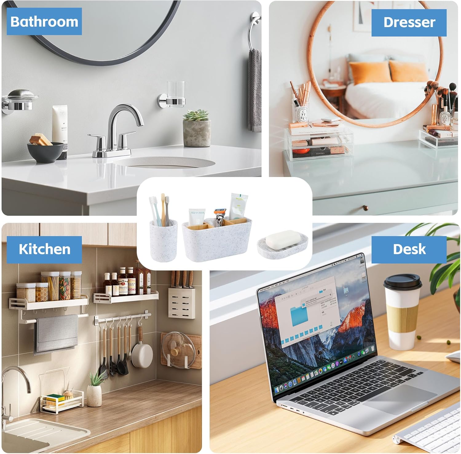 【Quality Material】Bathroom sets accessories are made of sturdy, shatterproof plastic that is very strong. The marble style looks elegant and complements the dividers made of natural bamboo, adding a natural freshness. The edges of the toothbrush holder set are rounded and smooth, no burrs to ensure safety, and the bottom is thickened to resist abrasion.