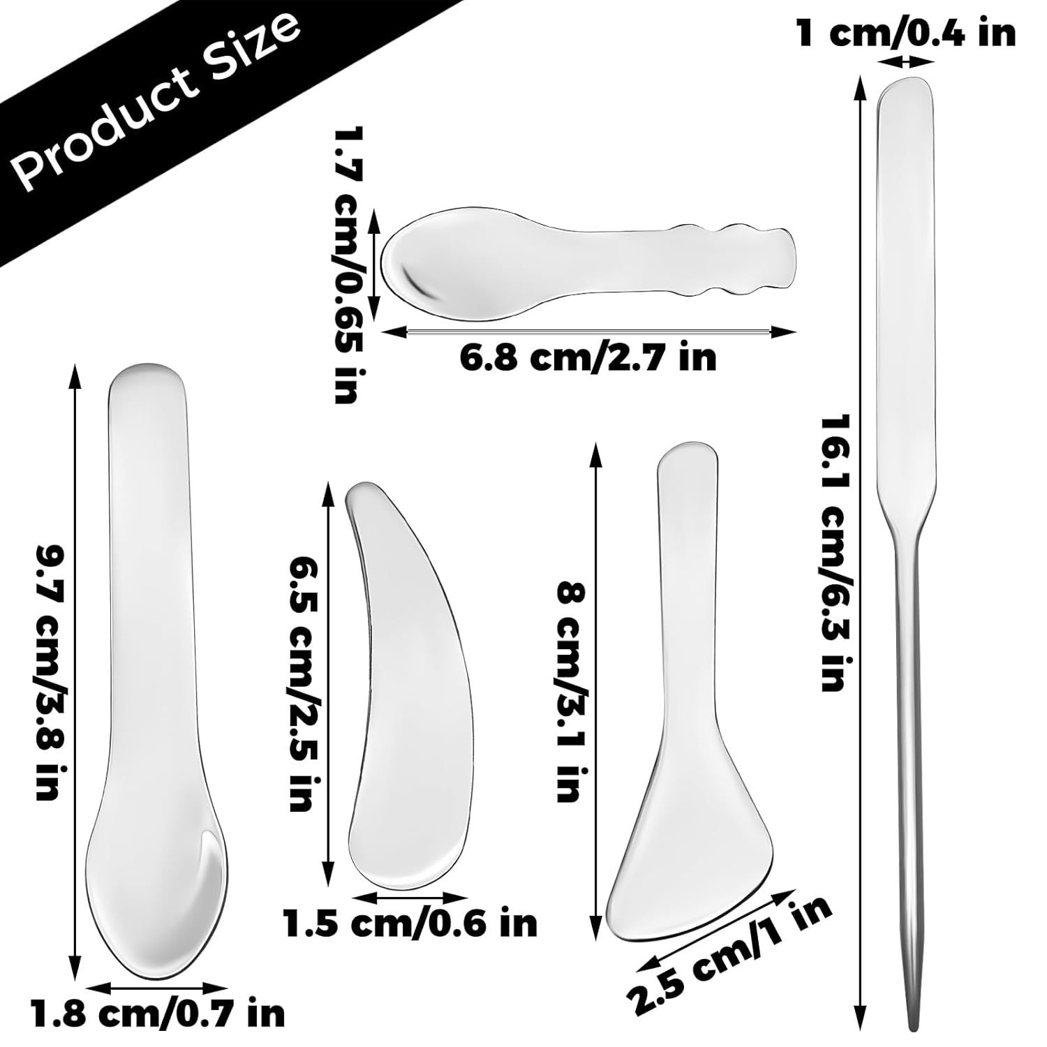 Product Summary: 5PCS Makeup Spatula Stainless Steel Skincare Spatula Mini Metal Cosmetic Applicator Facial Massage Beauty Tools Reusable Cream Spatula Beauty Accessories for Mixing Sampling Face Mask Cream Lotions