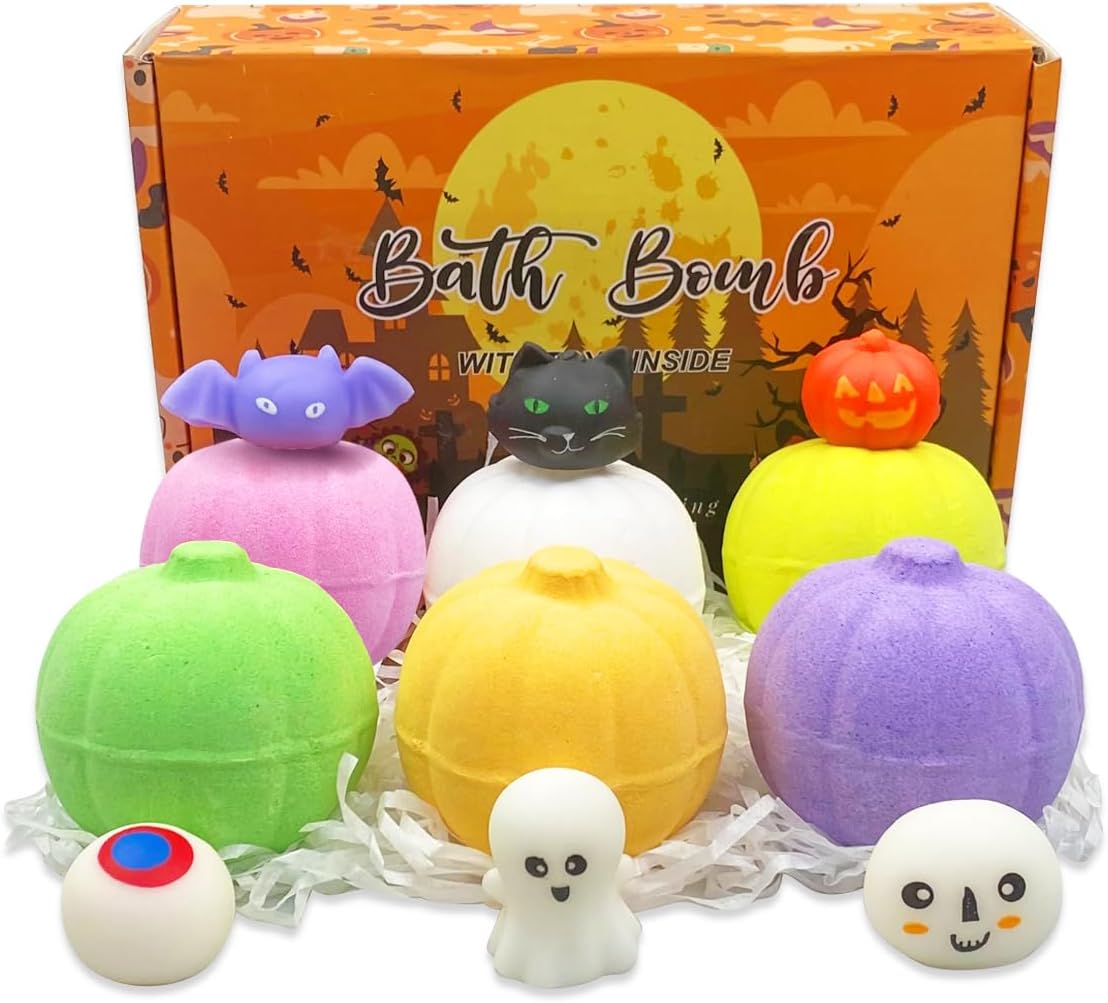 6 Pack Halloween Pumpkin Bubble Bath Bombs with Halloween Squishy Toys Inside for Kids Girls Boys Halloween Treat Bags Halloween Toys Gifts