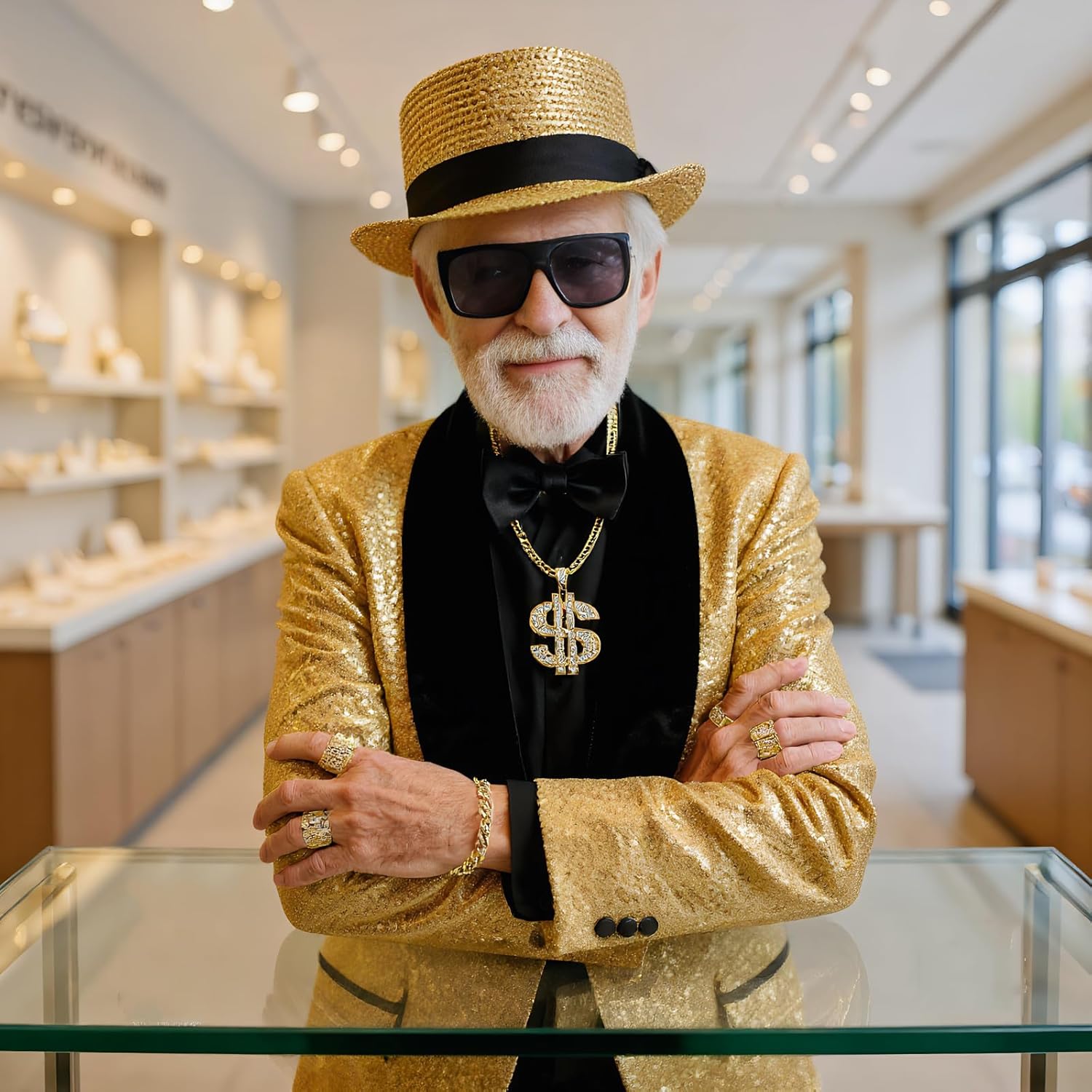 This rapper costume bundle includes stylish big gold chain necklaces, lucky Chinese rings, and bold dollar jewelry, all crafted with a premium metallic finish for long lasting shine.