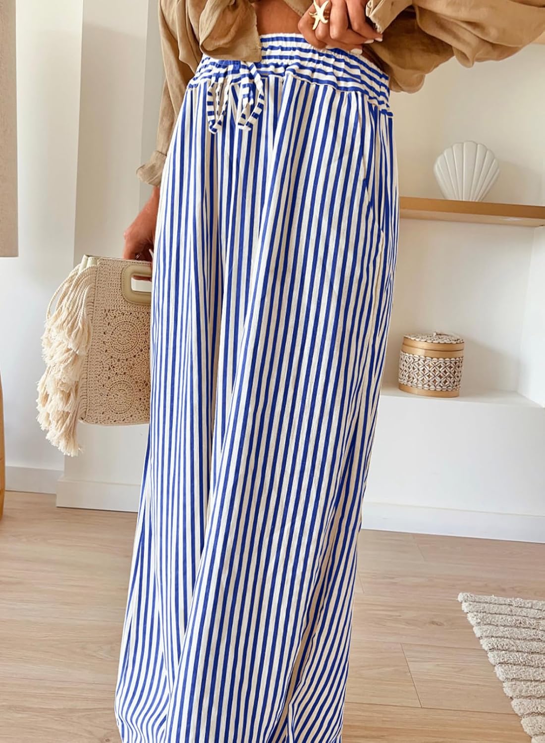 Acelitt Women Casual Drawstring Elastic Waist Striped Wide Leg Pants with Pockets, S-XXL