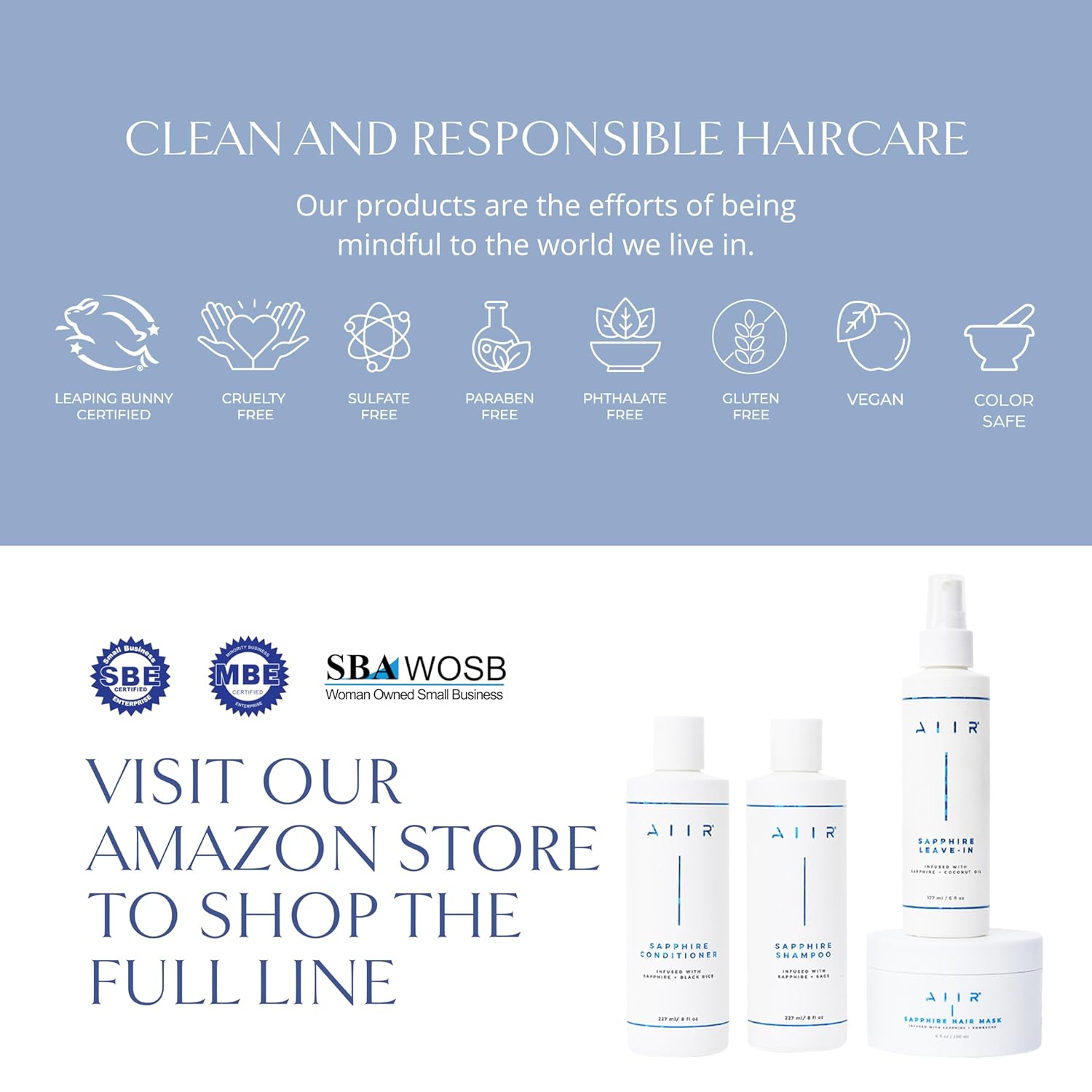 HOW TO USE: After AIIR Sapphire Shampoo and Conditioner generously mist sapphire leave-in conditioner to towel-dried hair and style as desired.