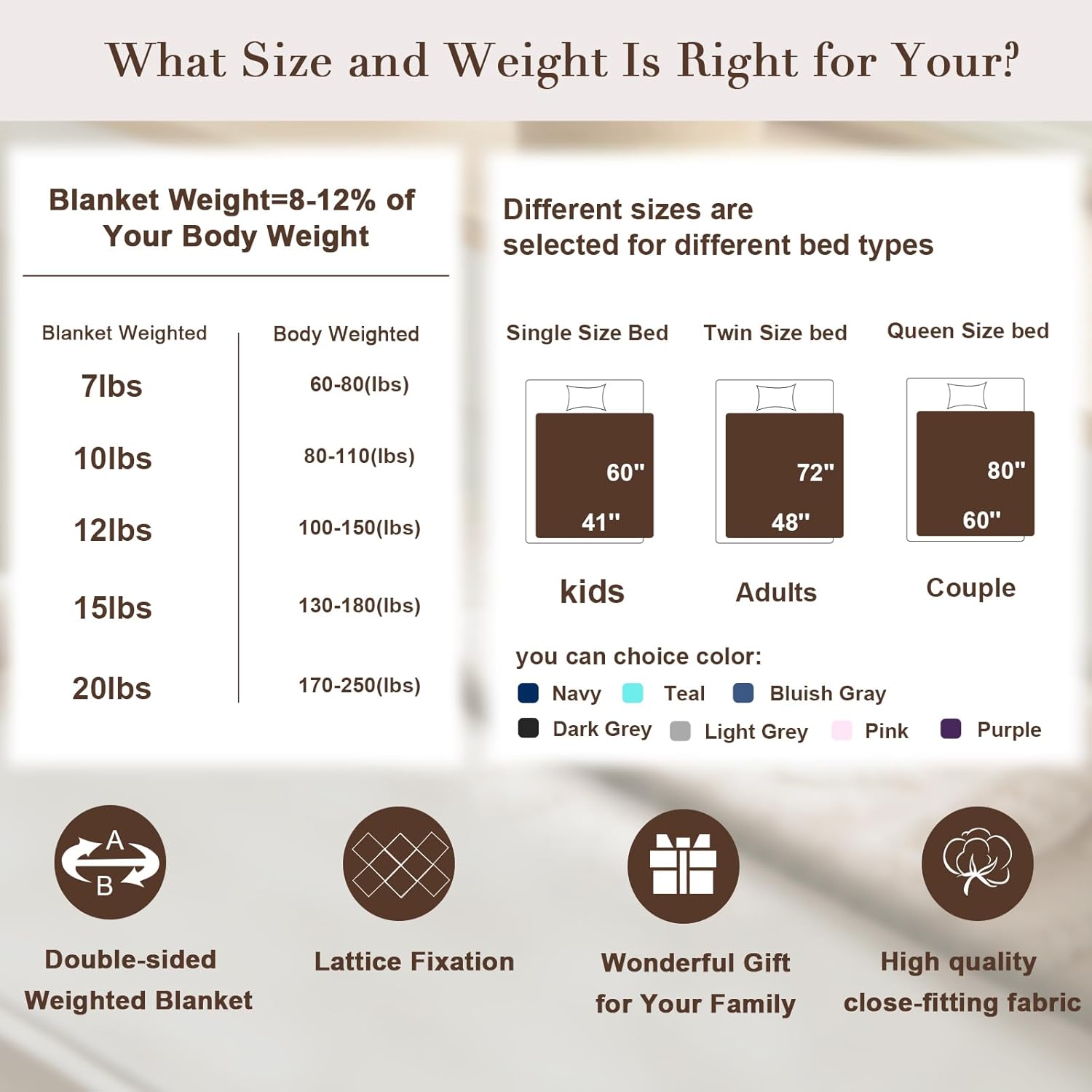 How to Choose Size : Take 10% of your body weight for reference. Note: The right weight of the blanket can be concentrated better on the human body, when the blanket is placed on a mattress of the same size, WITHOUT OVERHANGING, which may make you feel like it’s smaller. Please check our size chart before purchasing.