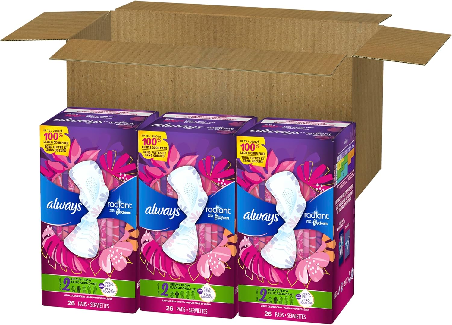 Always Radiant Feminine Pads for Women, Flexfoam Pads with Wings, Size 2, Heavy Absorbency, Lightly Scented, 78 Count (3 Packs of 26)