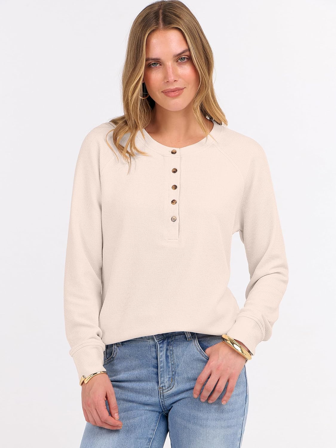 ANRABESS Women’s Long Sleeve Waffle Knit Shirts Dressy Casual Loose Button Up V Neck Henley Tops 2025 Fall Basic Tee Blouse