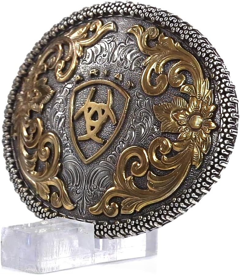 ARIAT Oval Buckle with Logo, Floral Scrolls and Filigree Detail, Antique Gold and Silver Finish, 3.75″x 2.75″