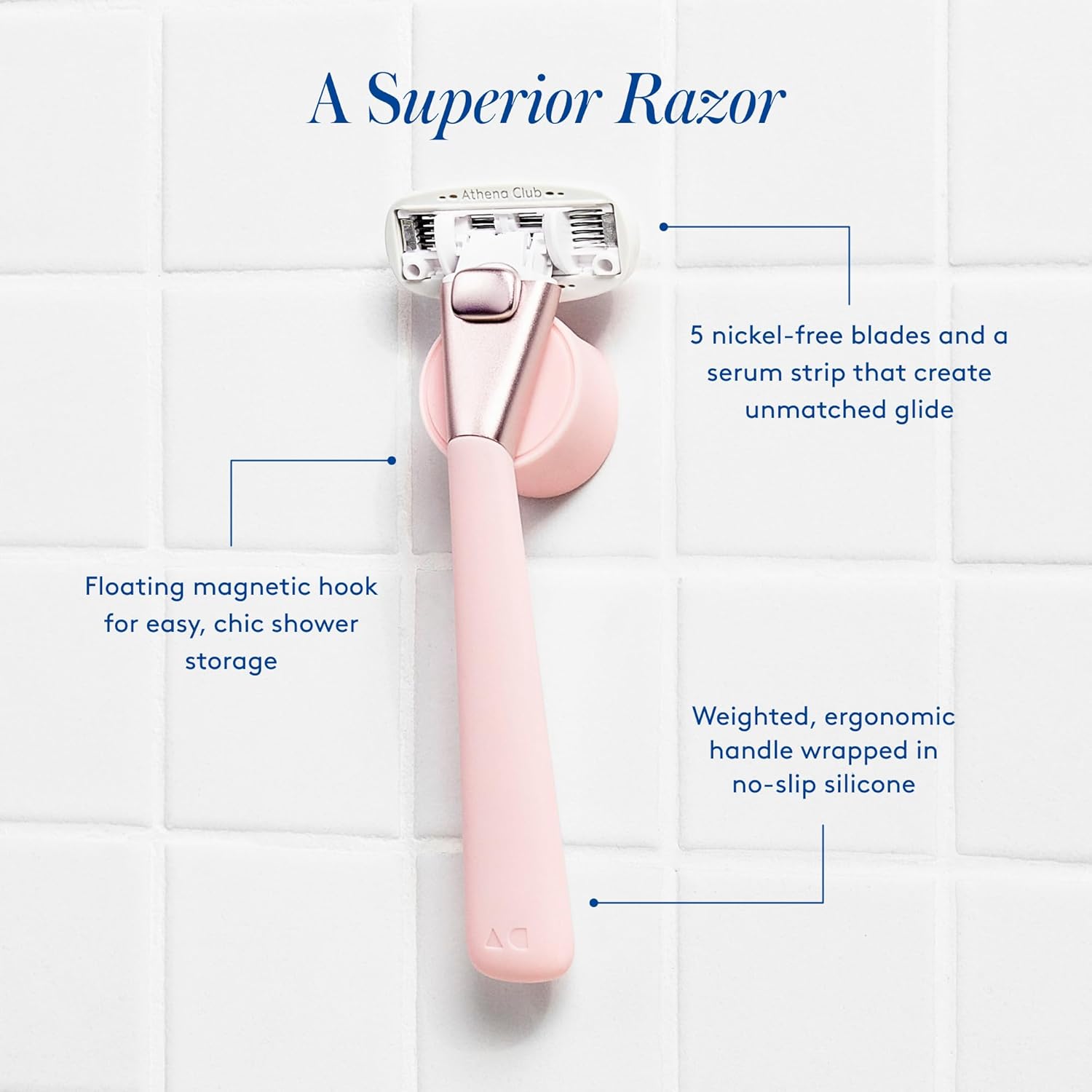 Each razor kit for women includes a non-slip ergonomic handle, a magnetic shower hook, 6 replaceable stainless steel razor blade cartridges (compatible with all Athena Club razor kits), and our signature Glossy Shave Oil in Super Pink so you’re always ready for your next shave.