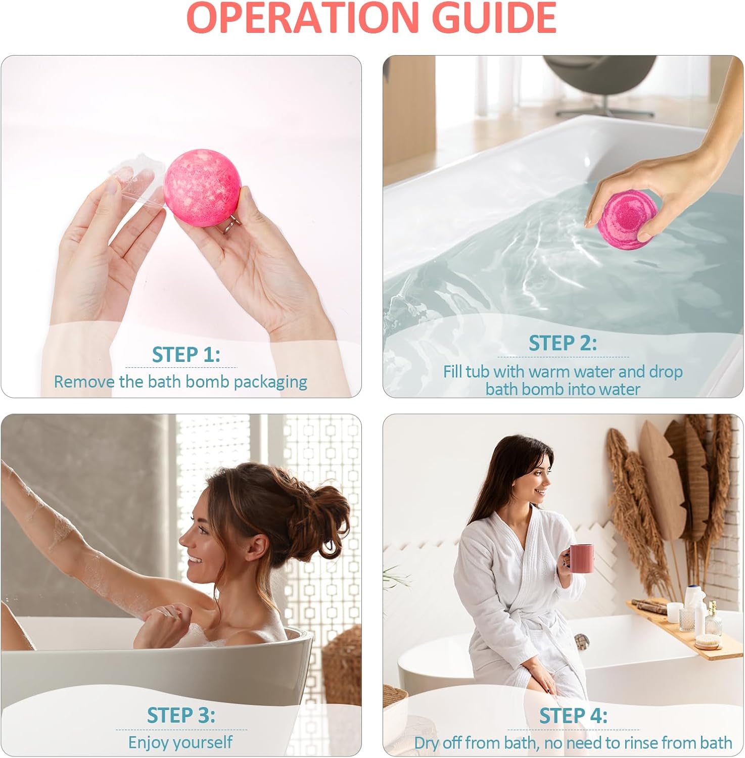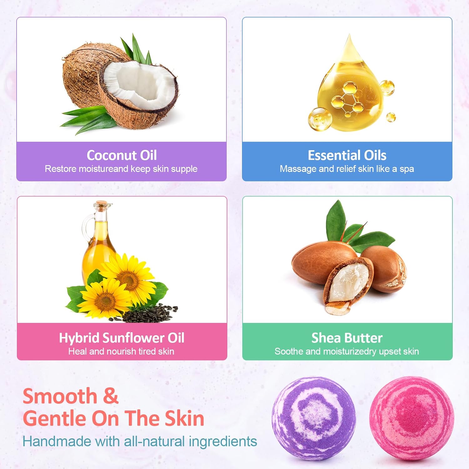 Natural Ingredients – Each bath bomb is crafted with natural essential oils, shea butter, Epsom salt, cocoa butter, and citric acid. The scented candles are made of high quality natural soy wax and 8% natural oils. Hand Lotions contain natural ingredients, plant extracts, enriched shea butter, aloe essence and VE.