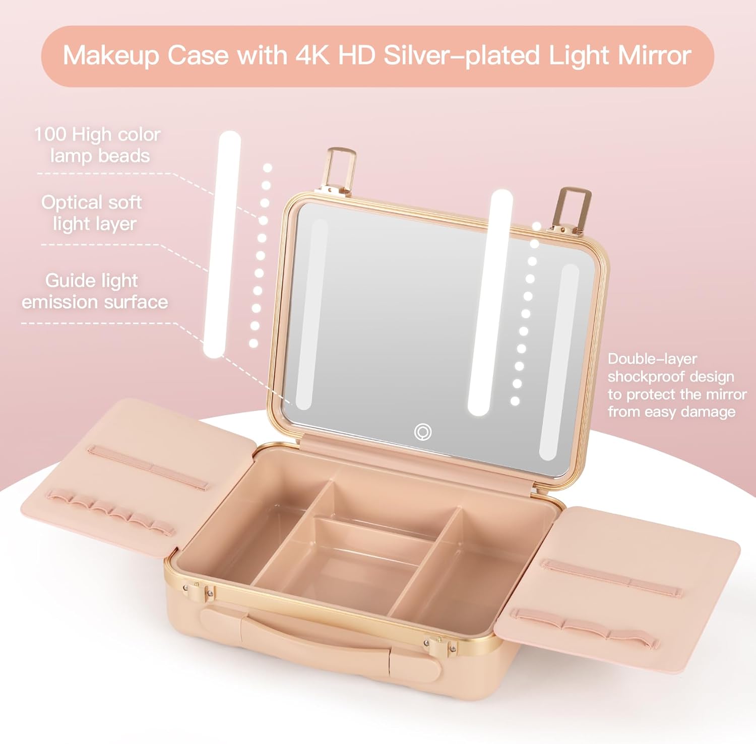 BEAUTY CASE Makeup Case with 4K LED Mirror, 12 Inch Shockproof ABS Hard Shell Cosmetic Organizer Bag, Portable Travel Vanity Box with Aluminum Frame, Snap Buckle, Gift for Women Girls, Pink