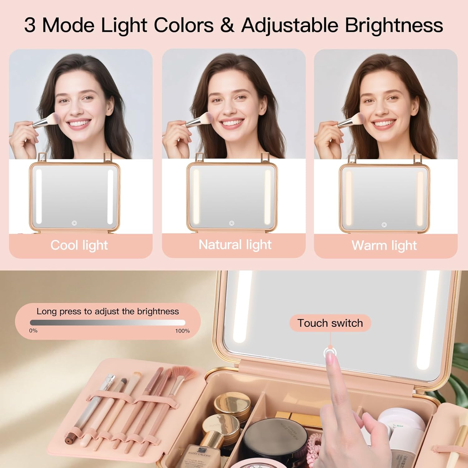 【4K HD Lighted Mirror with Adjustable Lighting】Enjoy flawless makeup with our 4K silver-plated mirror. Features 3 light modes (warm, natural, cool) and adjustable brightness—perfect lighting anytime, anywhere.Makeup Bag with LED Mirror comes with a 6000mAh rechargeable battery, it provides up to 30 hours of light with a simple touch, Powered by USB, rechargeable and eco-friendly.