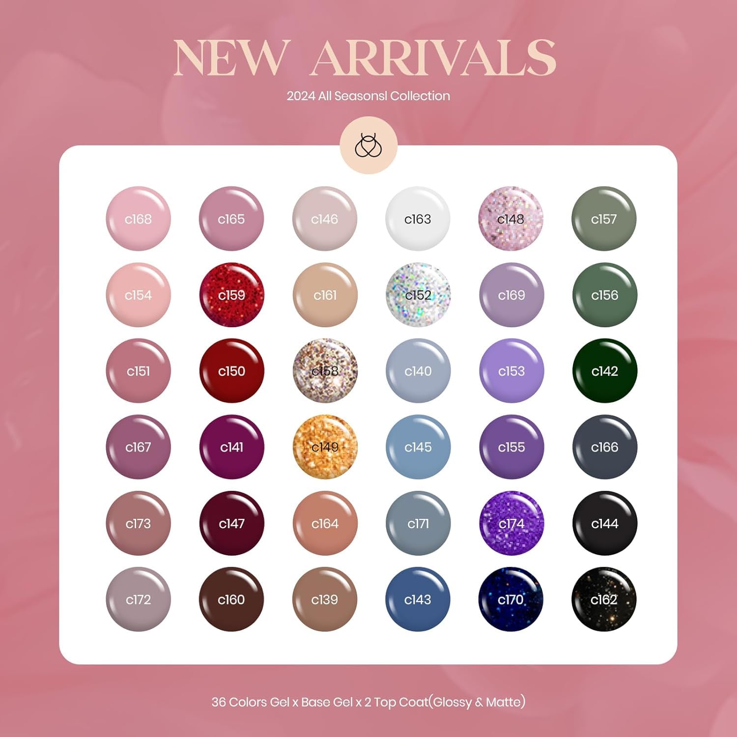 Beetles Gel Nail Polish Set 36 Colors Fall Winter Nail Gel Polish Kit Burgundy Red Blue Green Brown Gold Glitter Pink with Base Coat Glossy Matte Top Coat Manicure Gifts for Women Neutral Elegance