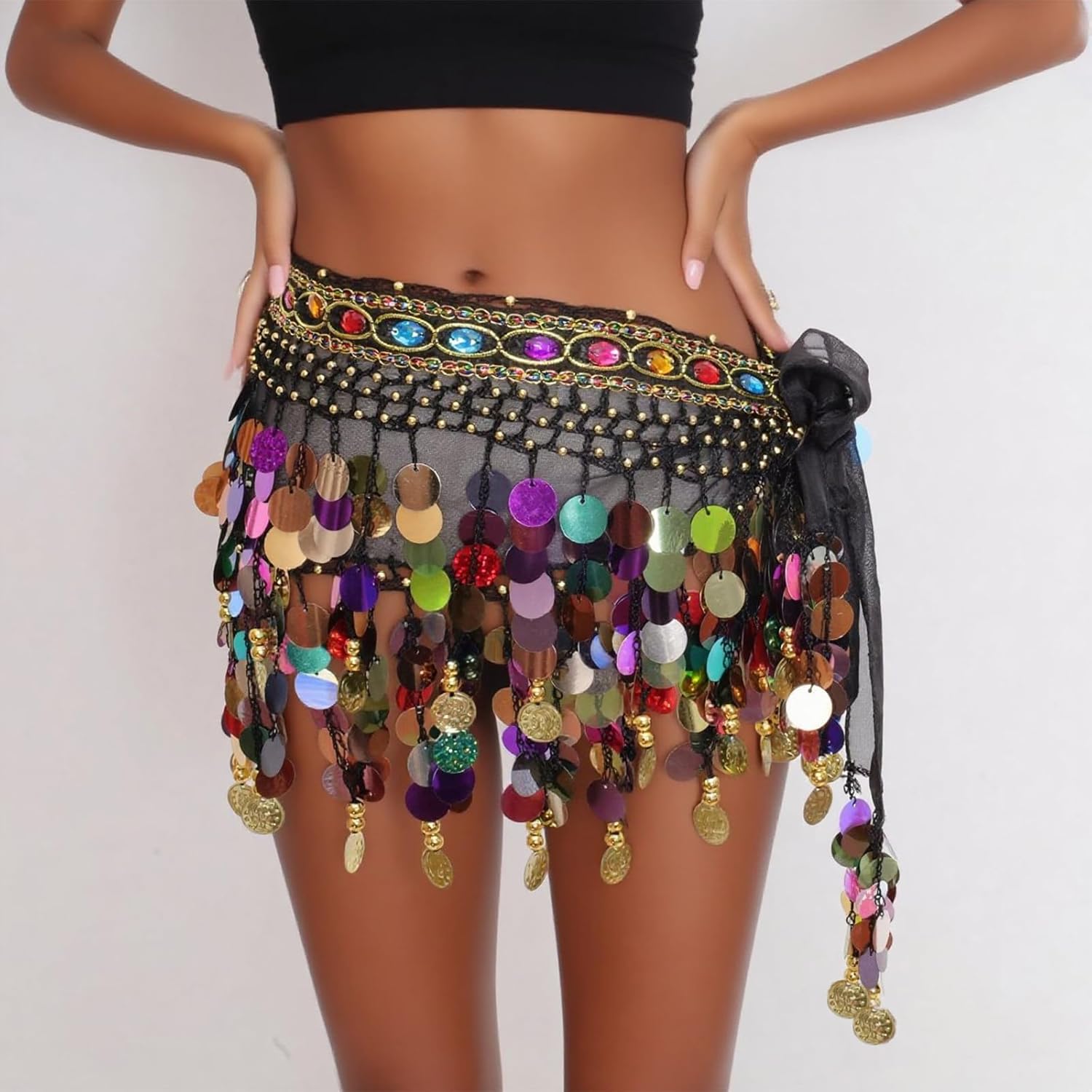 Belly Dance Hip Scarf Sequins Coins Skirt Wrap Belly Dance Coin Sash Costume with Golden Coins for Women