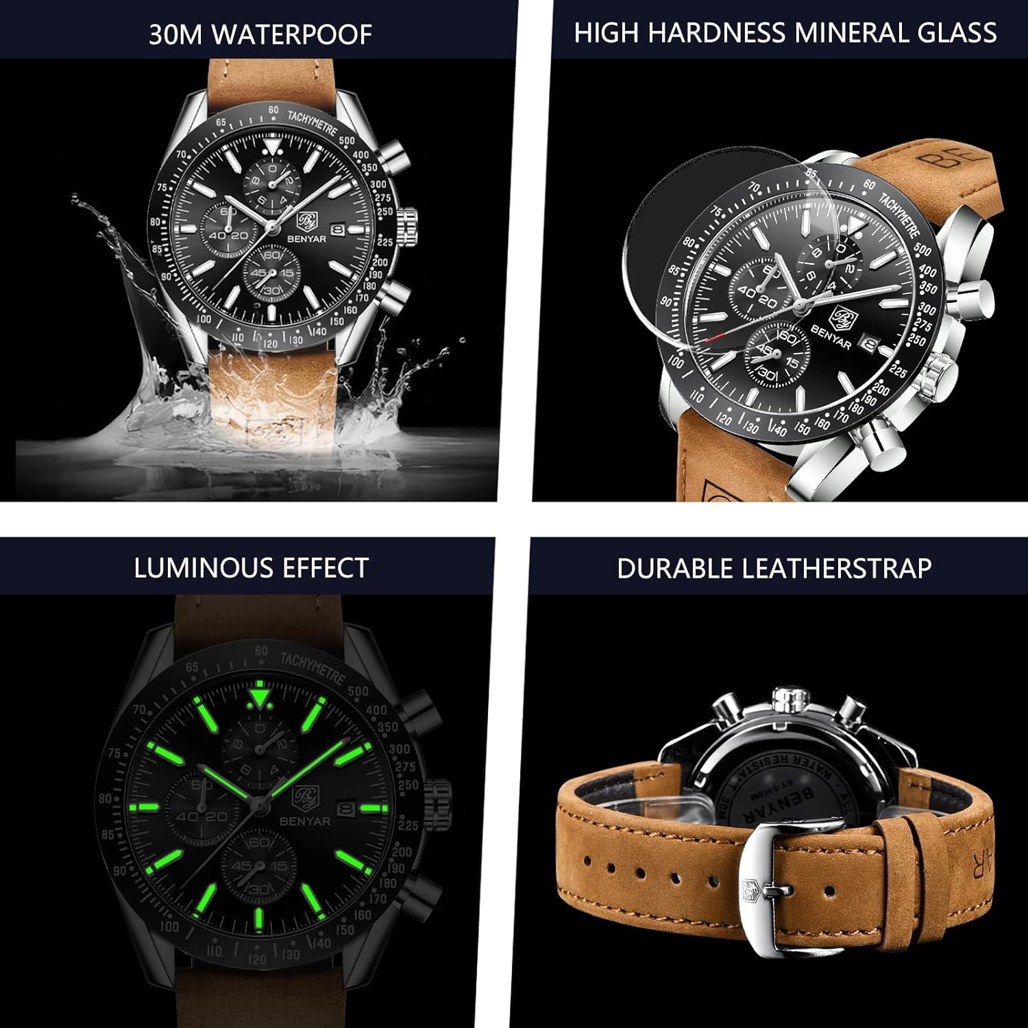 BENYAR Classic Fashion Quartz Chronograph Watch Casual Sport 30M Waterproof Leather Band Mens Watches