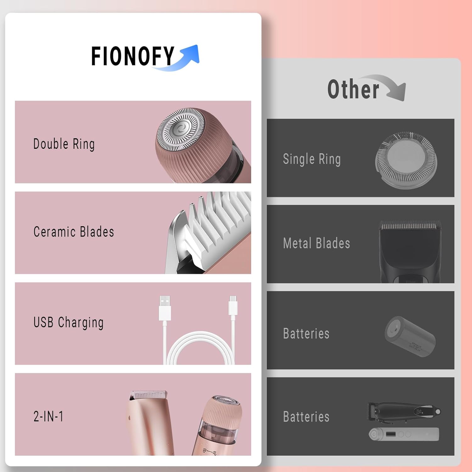 【2-in-1 Bikini Trimmer & Body Shaver for Women】The FIONOFY bikini trimmer for women is a versatile electric razor featuring dual professional heads. The body shaver smoothly trims arms, legs, and bikini zones, while the facial head delicately removes fuzz from cheeks, chin, and upper lips – making it the ultimate trimmer for women seeking full-body grooming.