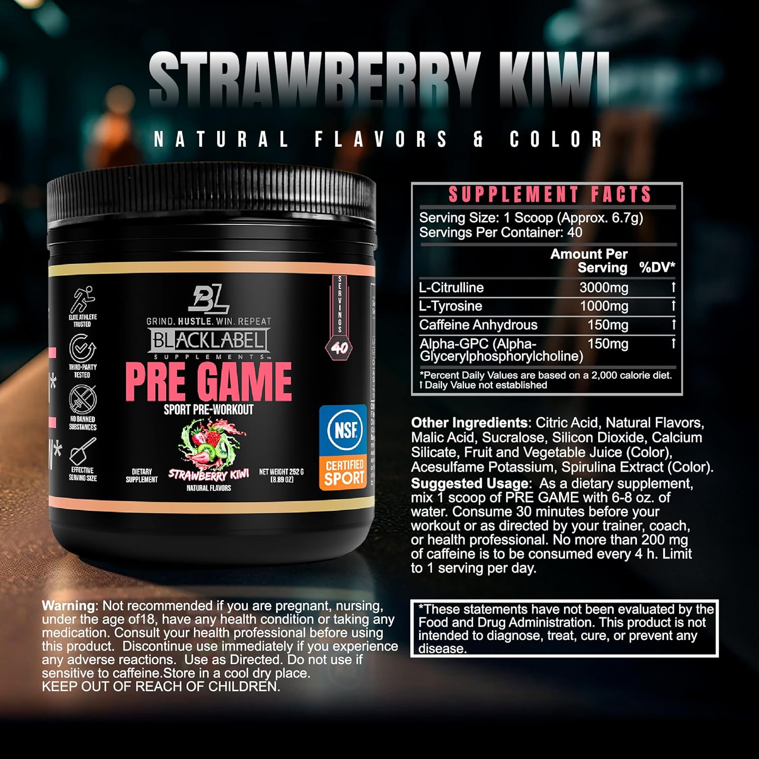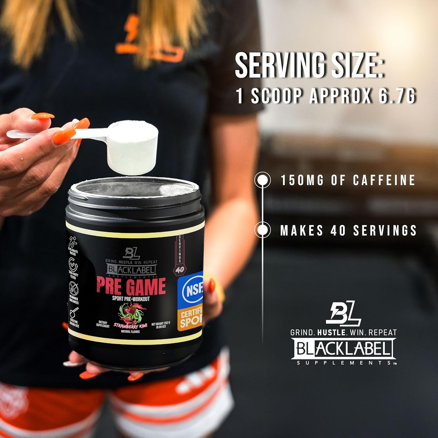 BLACKLABEL Supplements PRE-Game Pre Workout Powder, Strawberry Kiwi (40 Servings) – NSF Certified for Sport – Customizable 150mg Caffeine for Energy & Focus – Low-Stimulant Pre Workout for Men Women