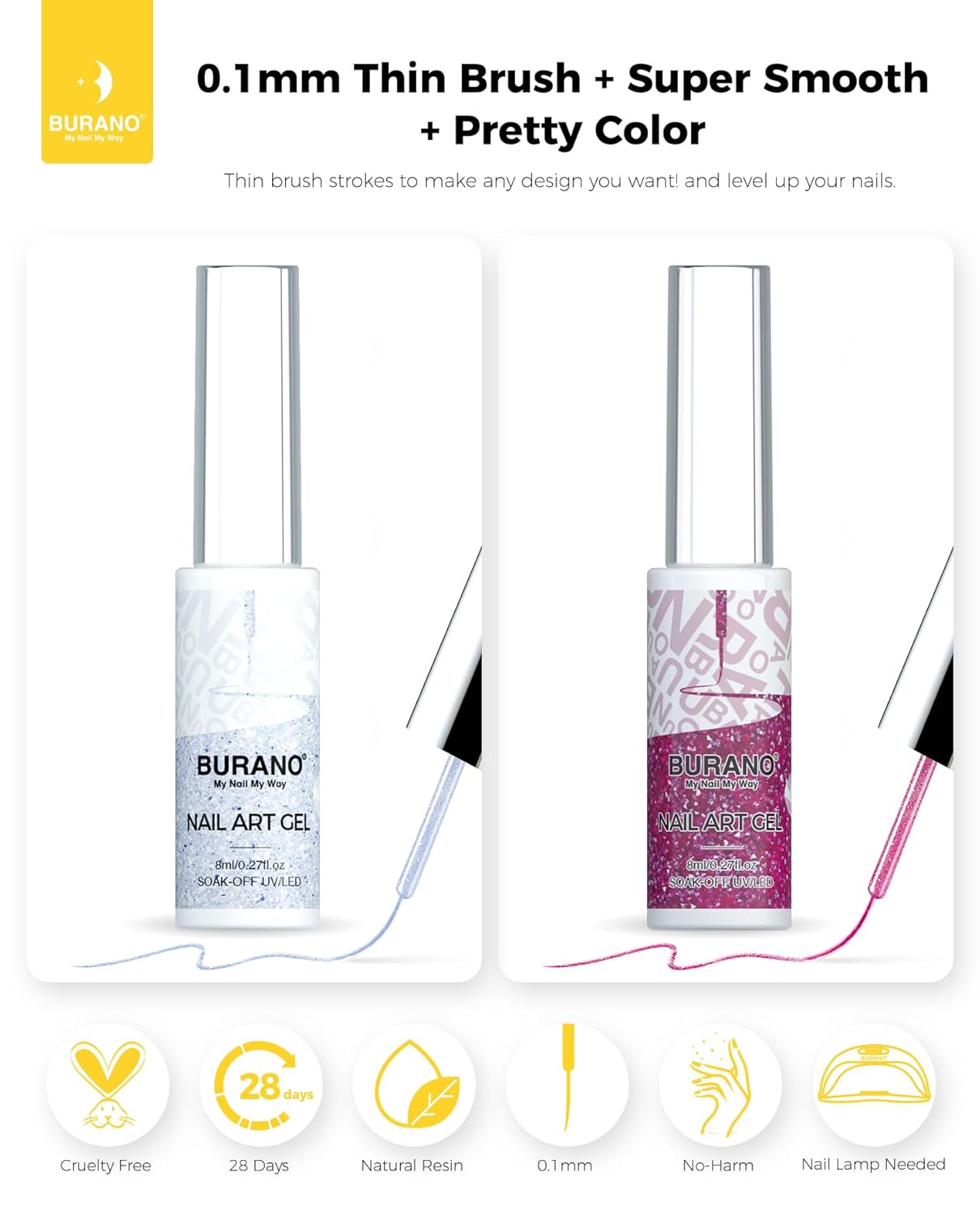 Long Lasting For 28 Days: BURANO nail Art liner gel nail polish can last 28 days, suitable for any nail system. No lifting, no damage metallic gel nail polish, silver gel art liners for nails