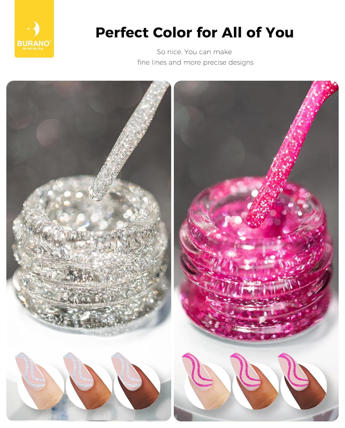 Upgraded Version Liner Gel Nail Polish: BURANO nail art liner gel nail polish, pure colors, Holographic Reflective Glitter Painted Gel, Silver Gold Liner Metallic Gel Nail Polish. So many colors to choose, suitable for home DIY and nail salon
