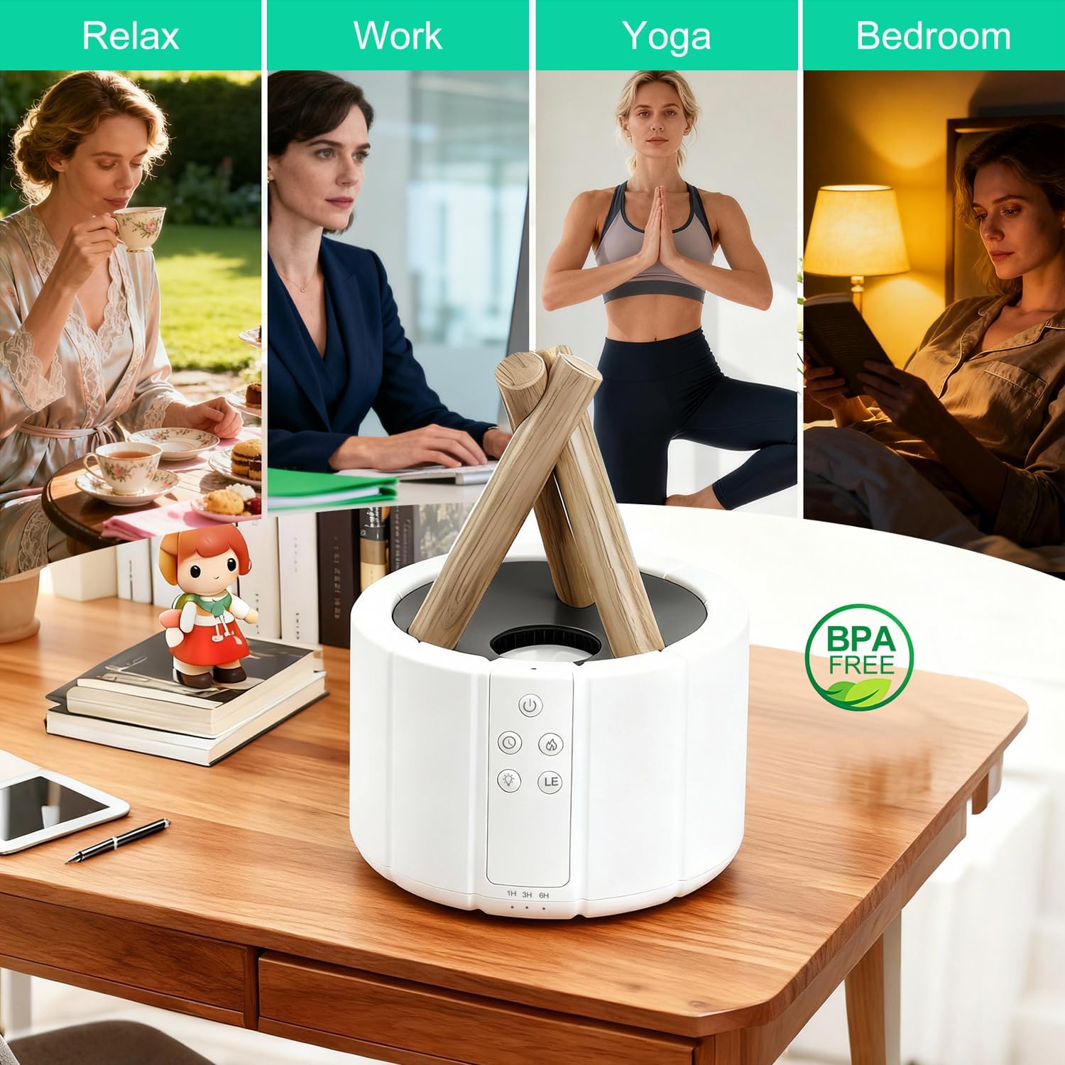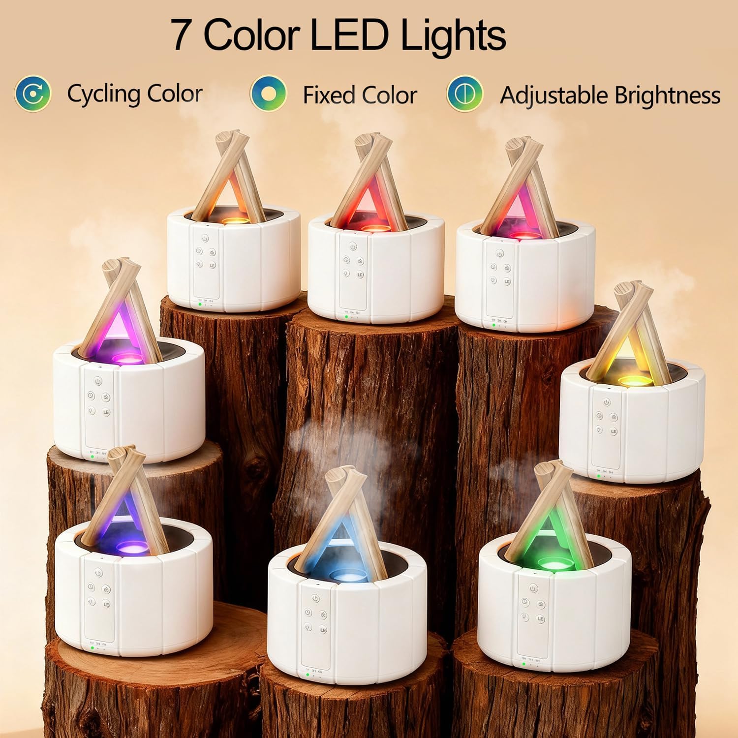Realistic Flame & 7-Color LED Light Effect – This diffuser features a bonfire-inspired design that creates a relaxing ambiance with its realistic campfire flame effect, mimicking the warmth and beauty of an outdoor bonfire. It offers seven LED colors—static, breathing, or cycling—allowing you to create a cozy, relaxing, or romantic atmosphere.