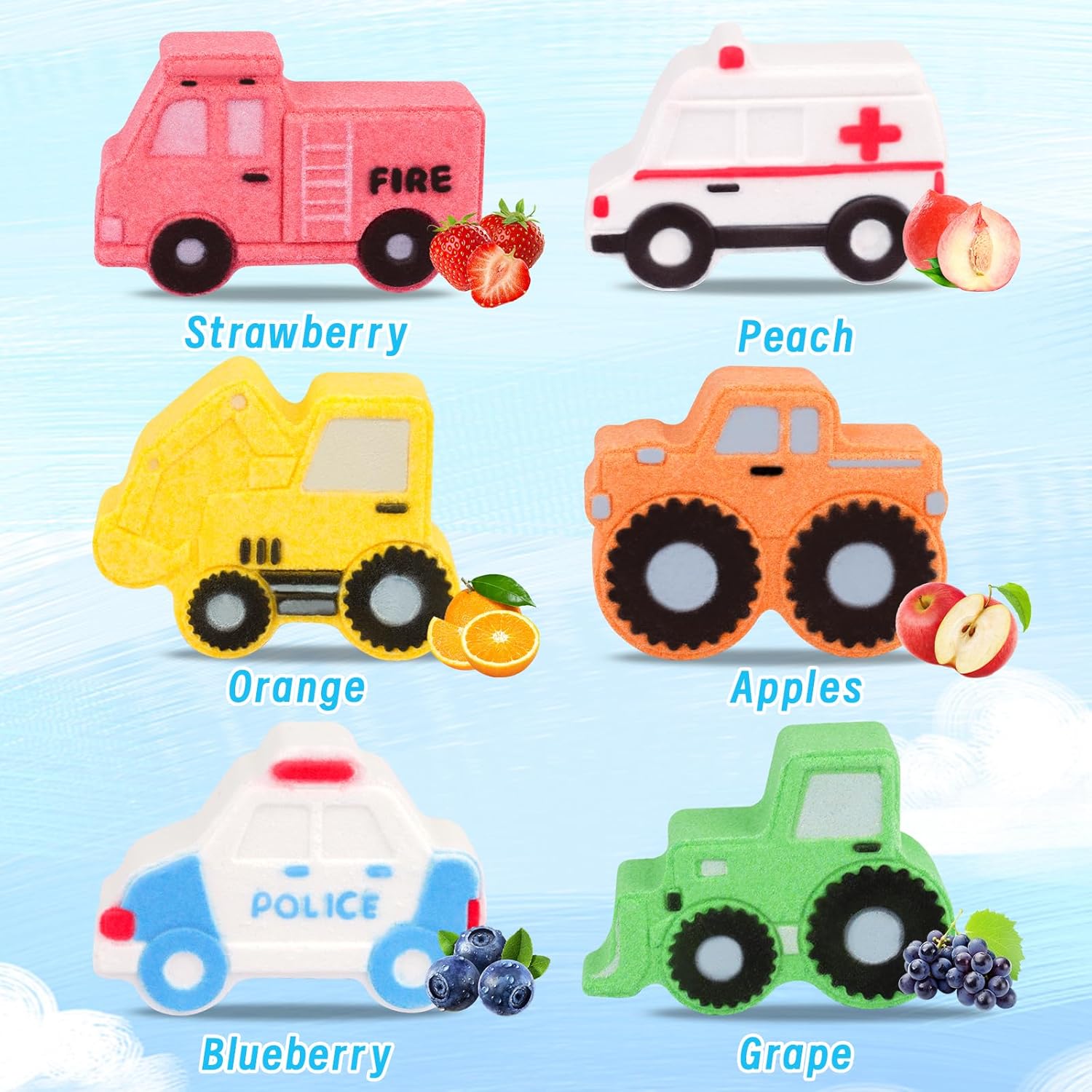 Fragrant Bubbles Bath: Each car bath salt features a distinct fruity fragrance, with six scents to choose from: Strawberry, Peach, Oranges, Blueberry, Apples, and Grape. Every bath ball uses fruit aromas for a uniquely refreshing