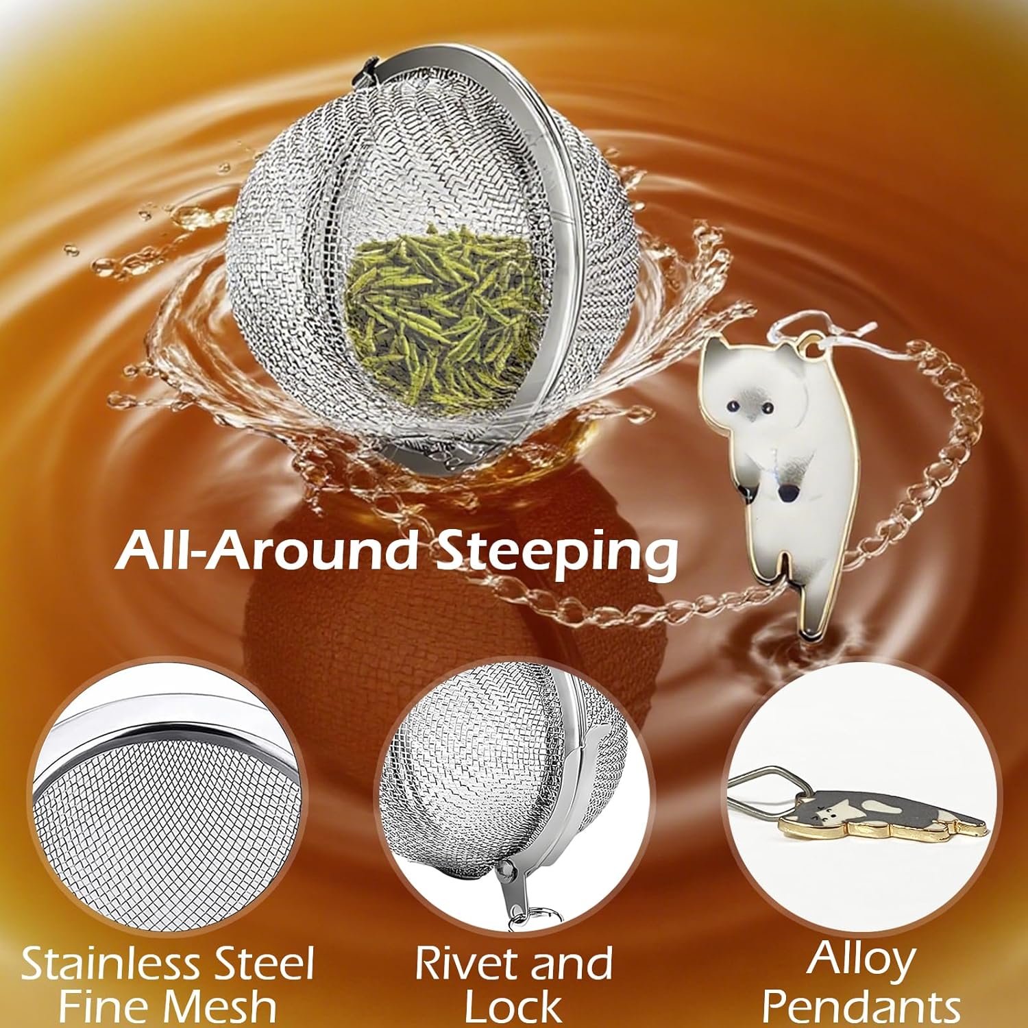 One-Handed Brewing Ritual = Flip → fill → dip. Lock clasp seals tightly while pendant chains double as drip-free hooks. Retrieve scorch-free tea balls from boiling water effortlessly.