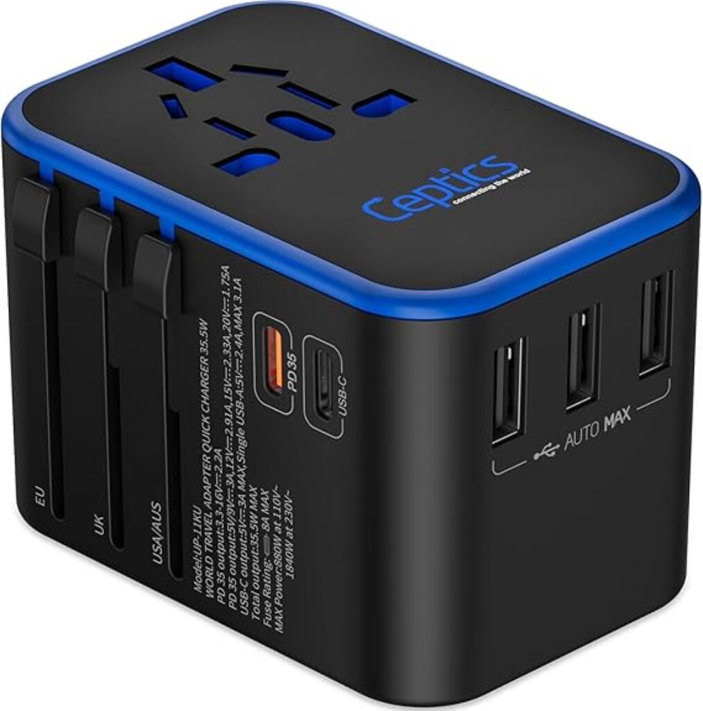 Ceptics Universal Travel Adapter, 35W International Power Adapter with PD & QC 3.0 Dual USB-C, 3 USB Travel Adapter Worldwide, Type I C G A Outlets 110V 220V A/C – EU Euro US UK (11-KU)